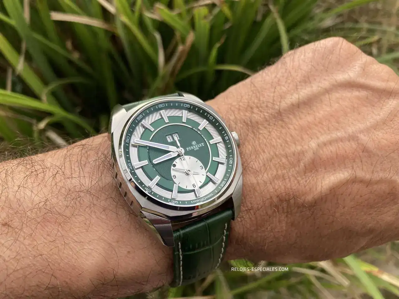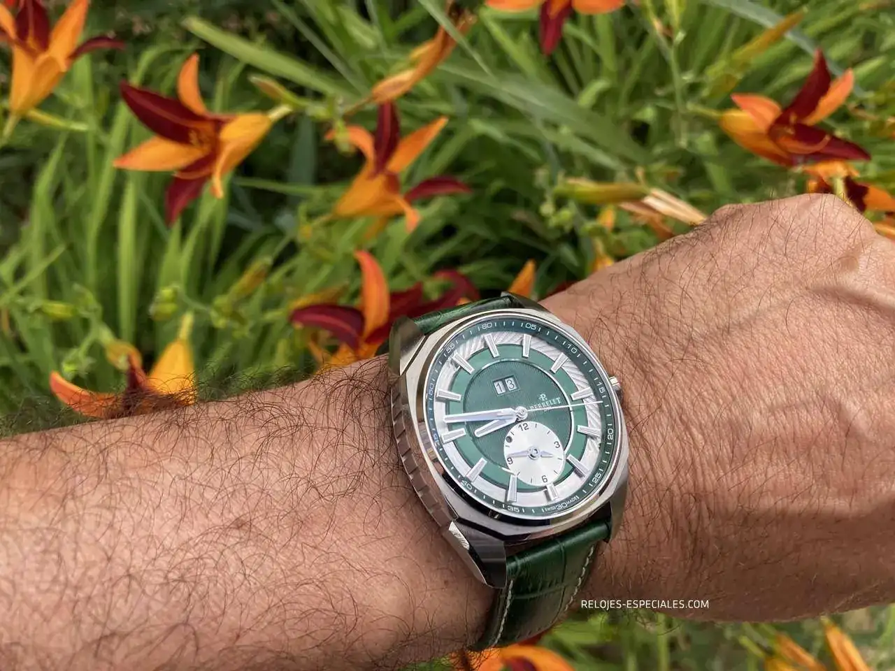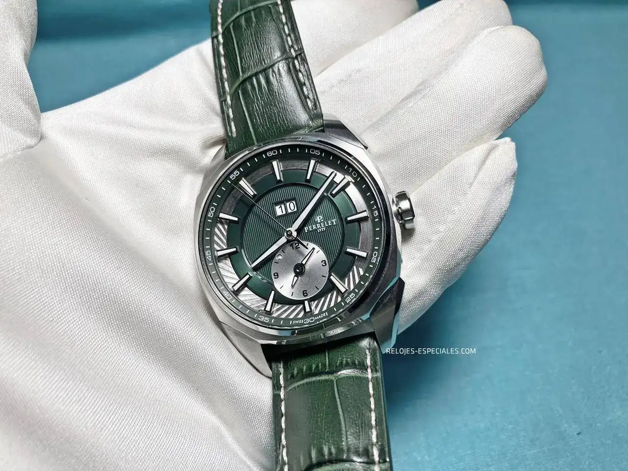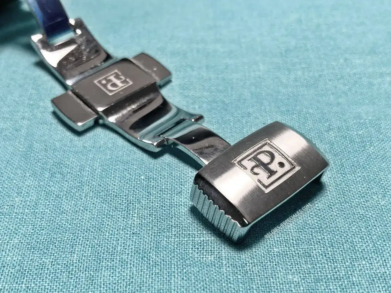 La correa es de becerro, aunque tiene un motivo o estampado de cocodrilo, y su interior es igualmente de piel (a diferencia de los Turbine, que lo tienen de caucho). El cierre desplegable de doble botón está trabajado, presentando un perlado en toda la parte que verá el usuario al manejarlo. Los laterales de la parte que aloja los botones presenta el mismo motivo decorativo que la carrura: unas acanaladuras que, aquí sí, recordarían el canto de moneda de Breguet. La parte frontal muestra bien definido el logo de Perrelet.