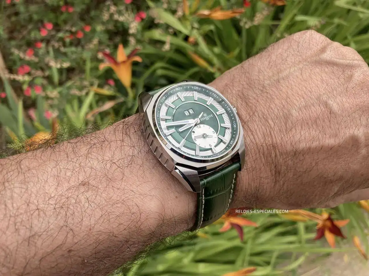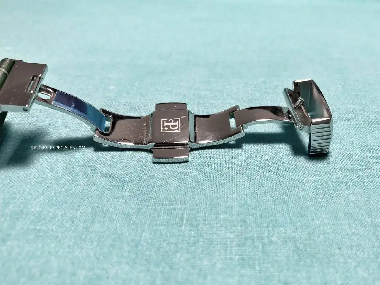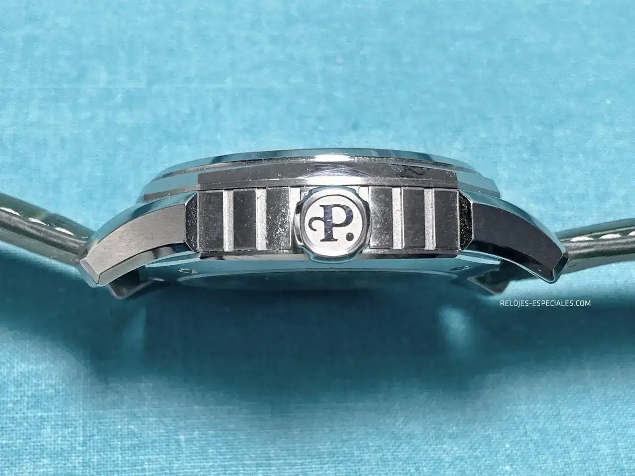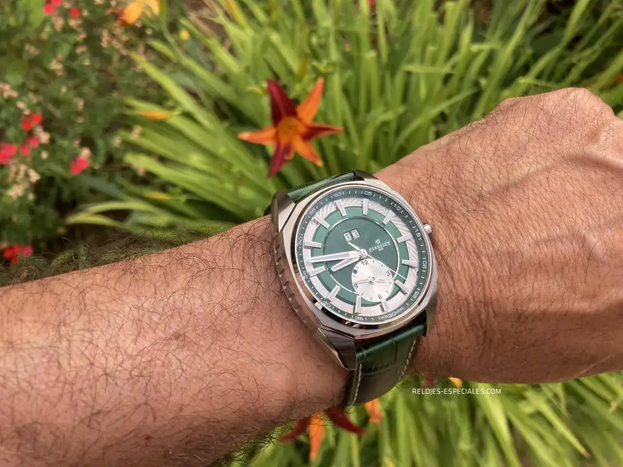 La correa es de becerro, aunque tiene un motivo o estampado de cocodrilo, y su interior es igualmente de piel (a diferencia de los Turbine, que lo tienen de caucho). El cierre desplegable de doble botón está trabajado, presentando un perlado en toda la parte que verá el usuario al manejarlo. Los laterales de la parte que aloja los botones presenta el mismo motivo decorativo que la carrura: unas acanaladuras que, aquí sí, recordarían el canto de moneda de Breguet. La parte frontal muestra bien definido el logo de Perrelet.