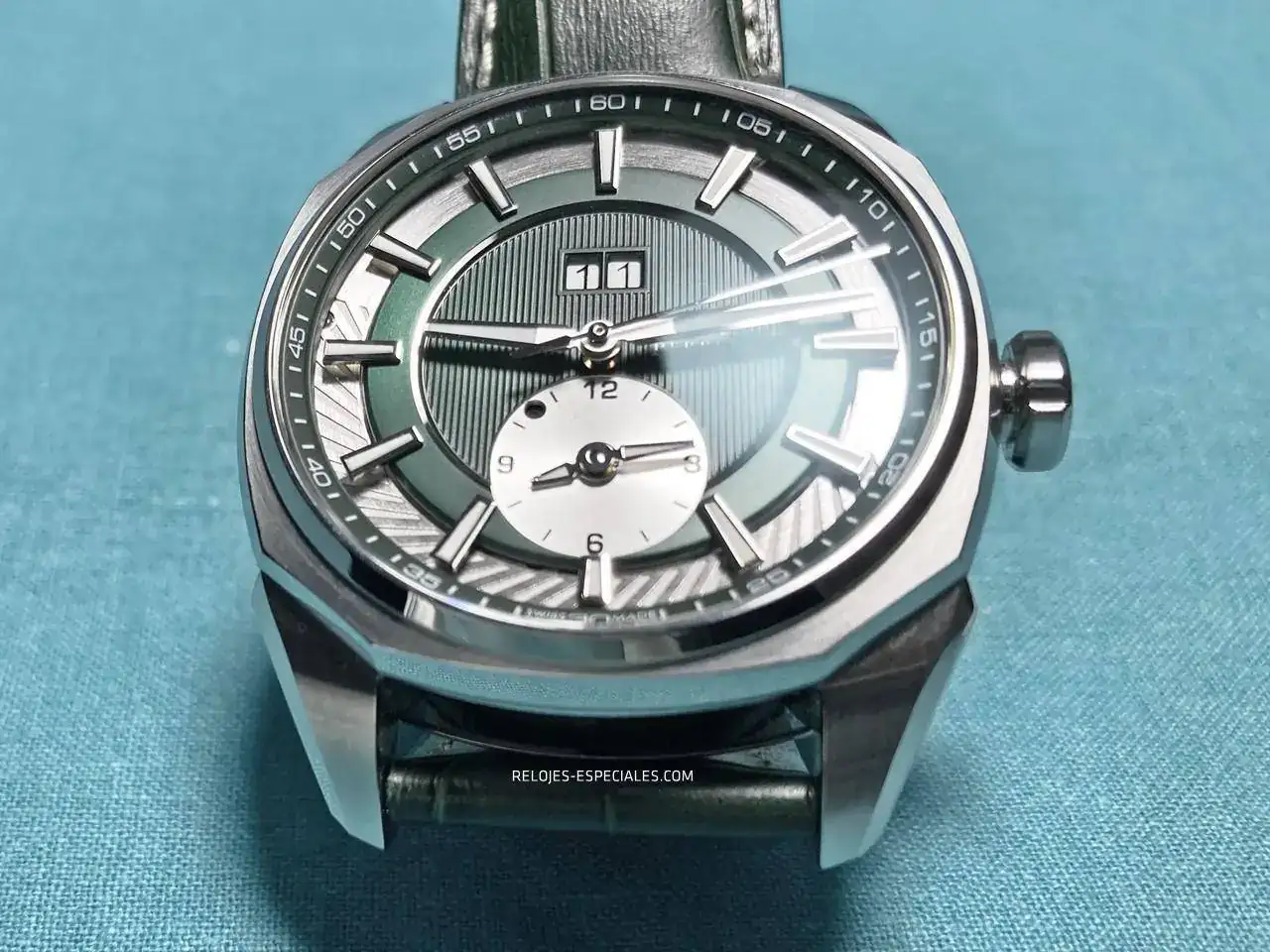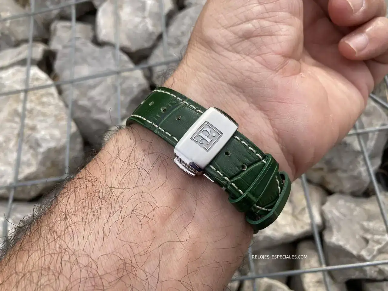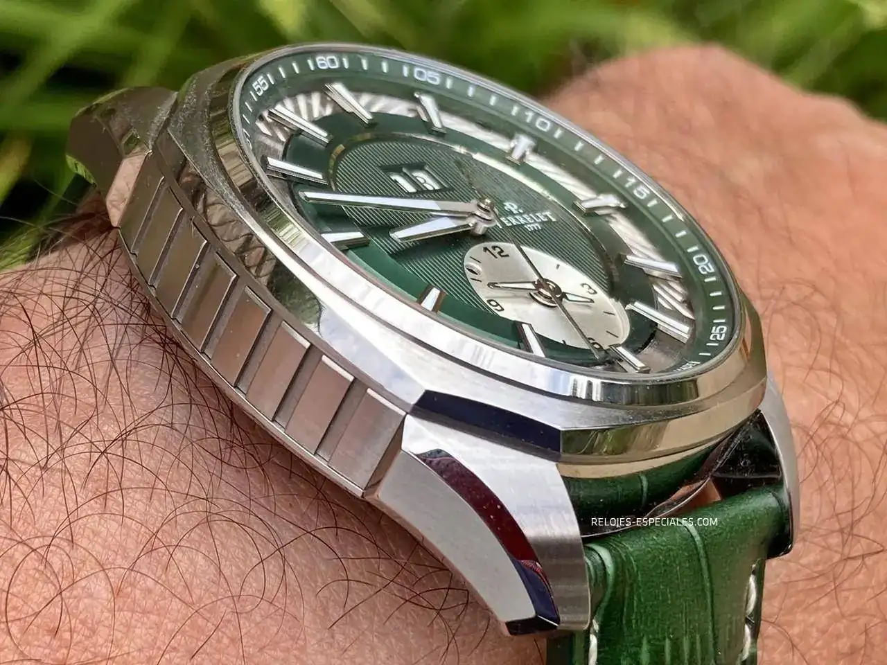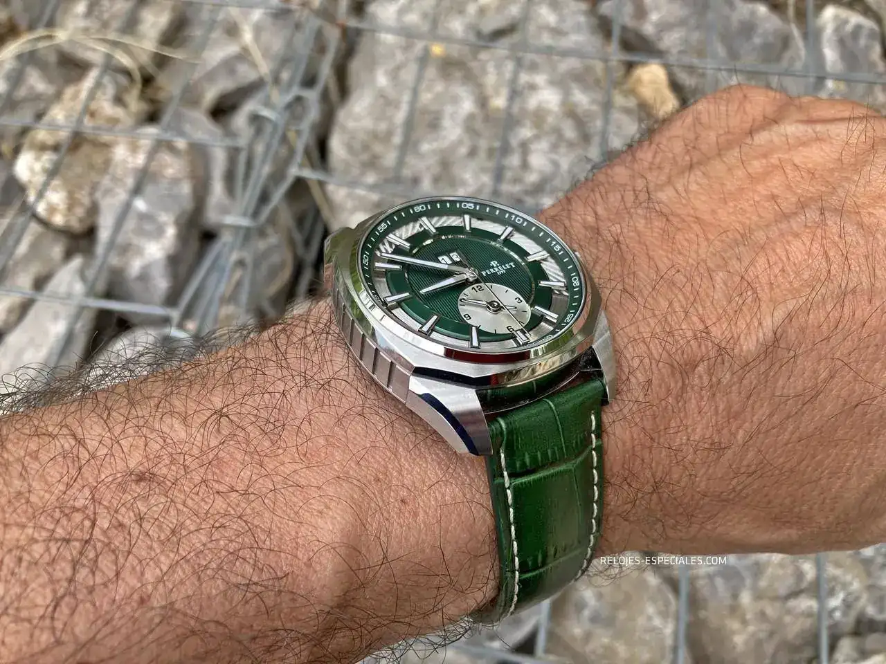 La correa es de becerro, aunque tiene un motivo o estampado de cocodrilo, y su interior es igualmente de piel (a diferencia de los Turbine, que lo tienen de caucho). El cierre desplegable de doble botón está trabajado, presentando un perlado en toda la parte que verá el usuario al manejarlo. Los laterales de la parte que aloja los botones presenta el mismo motivo decorativo que la carrura: unas acanaladuras que, aquí sí, recordarían el canto de moneda de Breguet. La parte frontal muestra bien definido el logo de Perrelet.