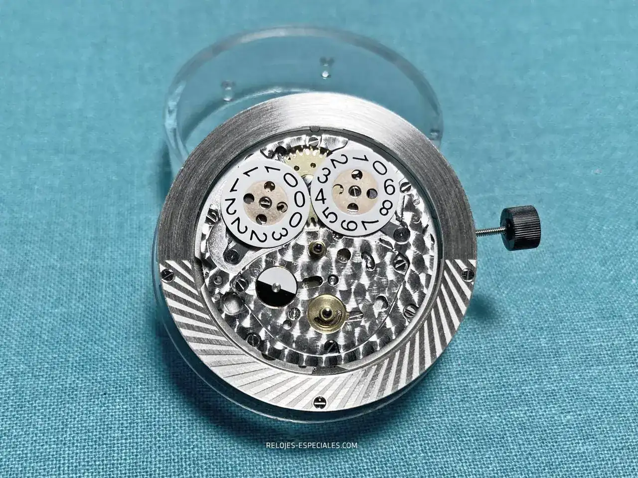 Para poder dejar a la vista el rotor o masa oscilante en el perímetro, la esfera tiene un diámetro sensiblemente inferior al del espacio donde se aloja, dejando los índices "flotantes" sobre dicho rotor. Volviendo al "aire de familia", éste está grabado en una de sus mitades con un motivo que podría recordar a las turbinas. Su función es dar visibilidad al movimiento "periferal" del mismo. Se pueden adivinar tres tornillos en la parte que casi oculta el anillo de los minutos exterior: sirven para fijar un contrapeso extra que rompe el equilibrio, permitiendo así la función de carga del muelle real.