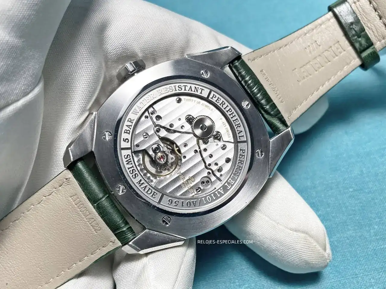El fondo, fijado con seis tornillos, es "casi" completamente plano (calculo que un milímetro y medio) y permite ver a través de su cristal el calibre P-421, que es una modificación del P-411 al que se le han añadido las complicaciones del segundo huso y la gran fecha. Teniendo como tiene la masa oscilate por la parte de la esfera, el efecto que produce es el de un calibre de carga manual. Además, que los puentes sean tan grandes y sólo dejen al descubierto el volante le da aspecto de macizo que haría pensar en robustez. Decorado con "Cotes de Geneve", se puede ver el perlado detrás del volante. Hay en todo su perímetro un anillo donde se inscriben datos del reloj: el modelo, la resistencia al agua (50 metros, un tanto insuficiente en mi opinión) y el Swiss Made.