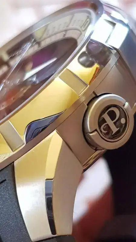 Con una construcción de lujo, caja de muy trabajada de 47 mm. con diferentes niveles y alternancia de pulidos a espejo y texturizado.