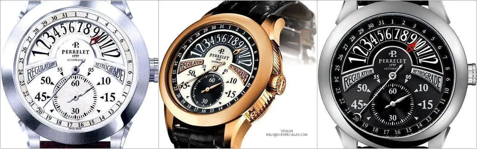 Como en tantos otros casos, la marca se reivindica como heredera del relojero homónimo, en este caso Abraham-Louis Perrelet, al que se atribuye la invención del rotor o directamente del reloj automático en 1778. Y es en el rotor donde Perrelet ha hecho más hincapié como elemento diferenciador: a diferencia de la mayoría de marcas, Perrelet lo muestra por el lado de la esfera. Pero no solamente: el hecho de estar integrado en el grupo Festina y con acceso a las manufacturas mencionadas le ha permitido producir desde cronos flyback hasta indicadores retrógrados.