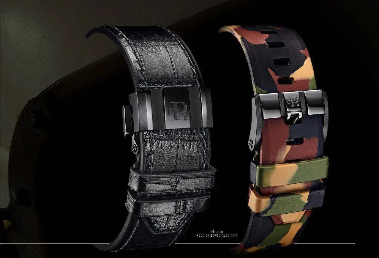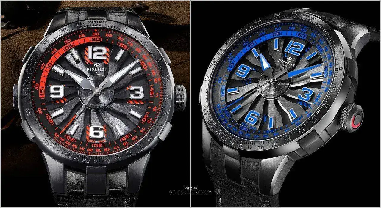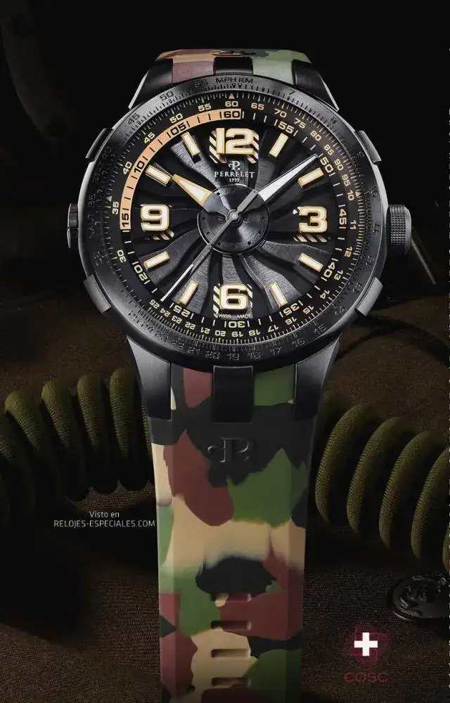 Volviendo al rotor en el frontal, en 2014 Perrelet presentó los relojes por los que tal vez sea más reconocible: los Turbine, de los que hizo multitud de temas, desde manga hasta poker, siempre coloridos y dejando entrever el contenido de la esfera al girar. Ahora, y reforzando ese parecido del que he hablado, trae los nuevos turbine con un aire aviador, los Turbine Pilot igualmente cromáticos a los que ha añadido una regla de cálculo que se acciona con la corona situada a las 3 (la de remontuar y puesta en hora, a las 9. Cajas de 48mm de diámetro de acero con tratamiento PVD negro y correas mixtas de piel y caucho (excepto la camo, toda de caucho). Cristal de zafiro en ambas caras El calibre -de manufactura- se llama P-331-MH, tiene 25 rubíes y vibra a 28.800 alternancias por hora para una reserva de marcha de 42 horas. Es -obviamente- automático y está certificado por el COSC.