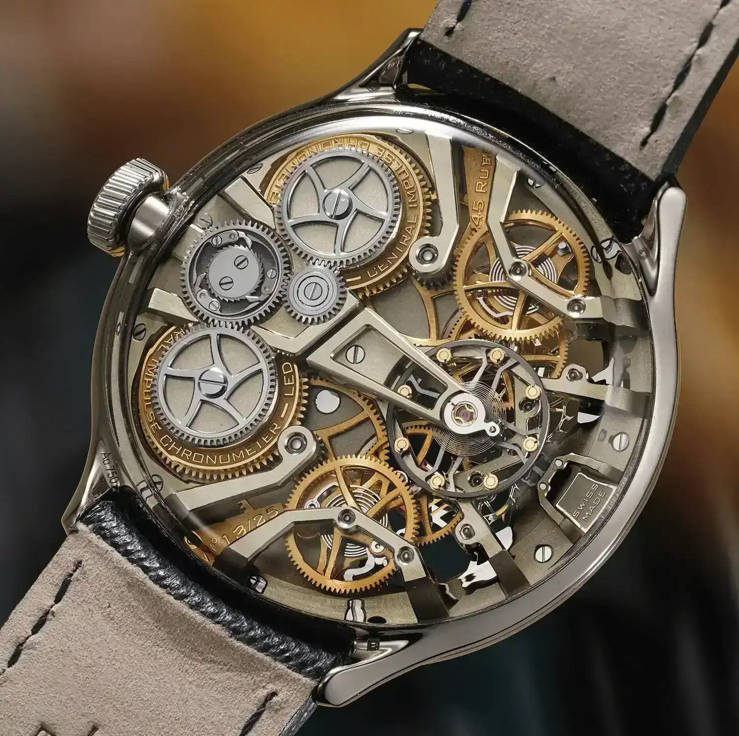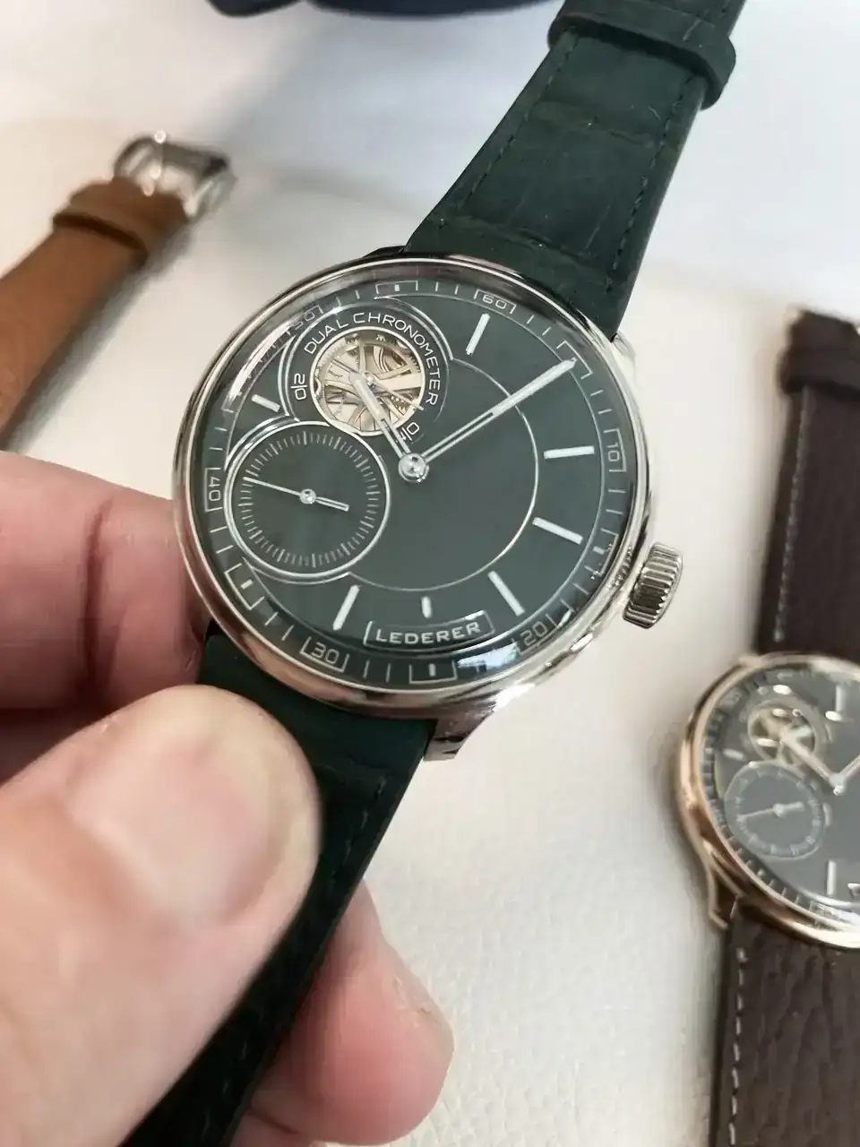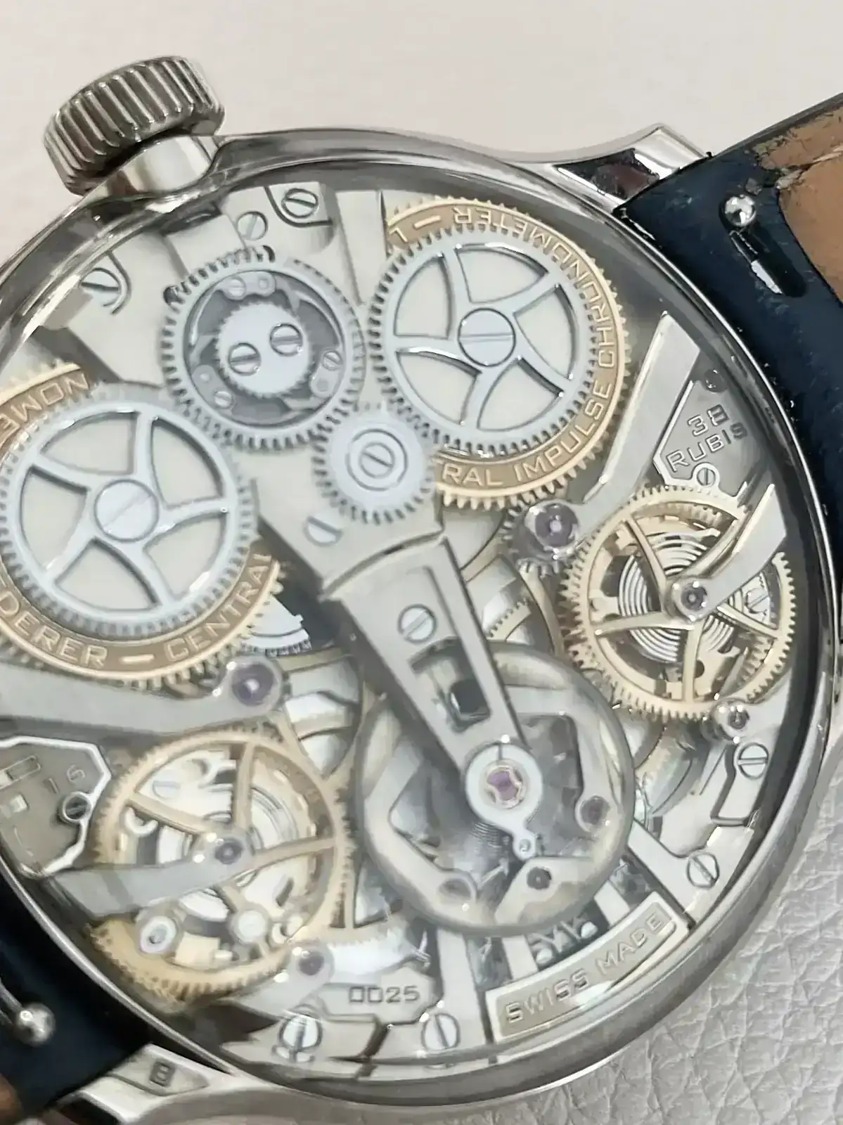 Hay ahí un reloj -varios, en realidad- que a primera vista no llaman demasiado la atención y pasan desapercibidos junto a tanto Patek, Rolex o incluso FP Journe. Uno de ellos es el Lederer Chronometer Central Impulse, cuyo lado esfera es hasta cuestionable ( a mí me cuestan esos diales tipo "Open Heart") mientras que su trasera es algo celestial. No solo por el mecanismo que encierra, sino porque toda la trasera es un solo cristal de zafiro que, ahí sí me encanta, lo enseña todo: