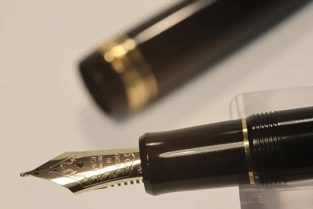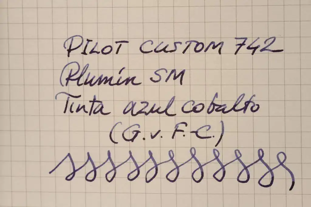 Del diseño poco se puede añadir: clásico y de luto. Parece bien construida, aunque la calidad de los plásticos es peor, por ejemplo, que la de las Sailor 1911. En cuanto a su plumín, me tiene mosqueado que a veces fallen algunos trazos iniciales de las letras, como por ejemplo el trazo descendente del palo de la pe mayúscula, y, desde luego, no es una pluma para firmar con ella, porque una rúbrica algo rápida la pone en evidencia. Tiene un trazo M jugoso que en ocasiones, y según el papel que utilice, puede tender más a un B. Presenta una ligerísima variación en los grosores de trazo si se quiere dar un matiz caligráfico a la escritura, pero no es ni mucho menos un plumín flexible ni semiflexible. Y, como muchos plumines japoneses, proporciona una ligera sensación de aspereza al escribir, aunque eso no me coge ya por sorpresa. Un detalle que me ha gustado mucho ha sido el convertidor vacumático, incluido en la dotación de la pluma. En términos generales, se puede decir que es una buena pluma.