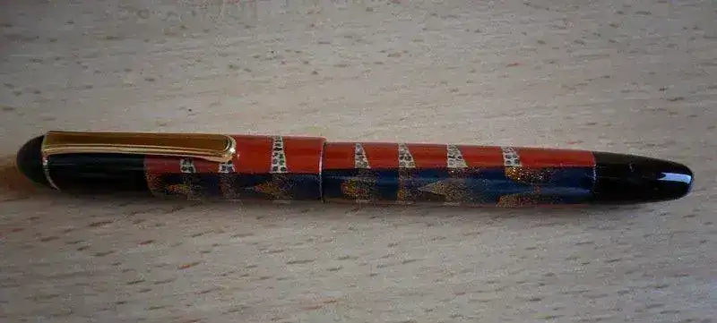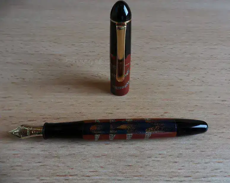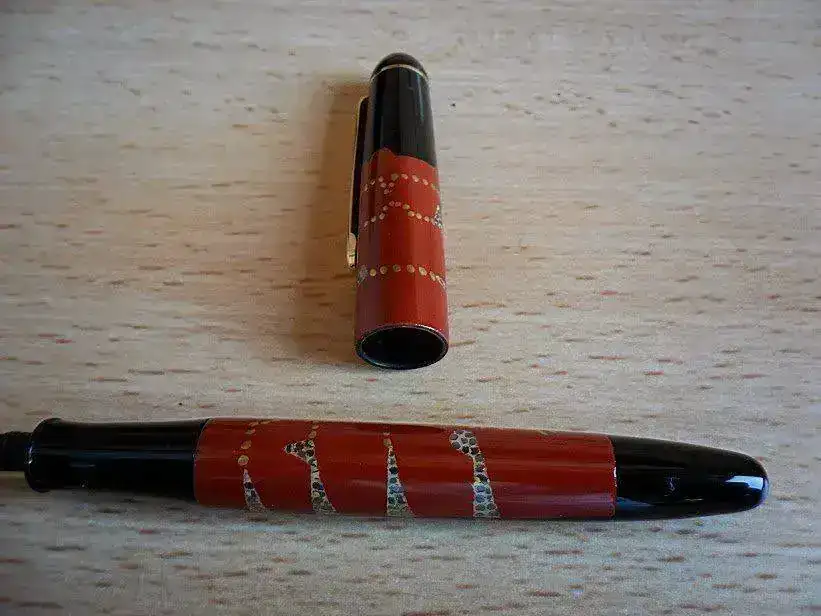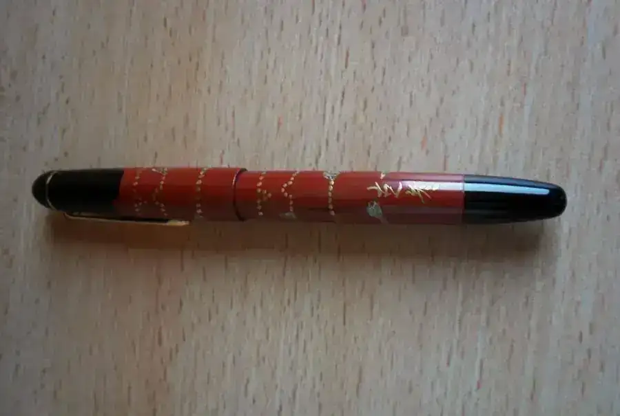 - El diseño de esta pluma estilográfica es Akanofu#70, un curioso acabado en rojo, plata y polvo de oro con lacado Urushi Maki-e.