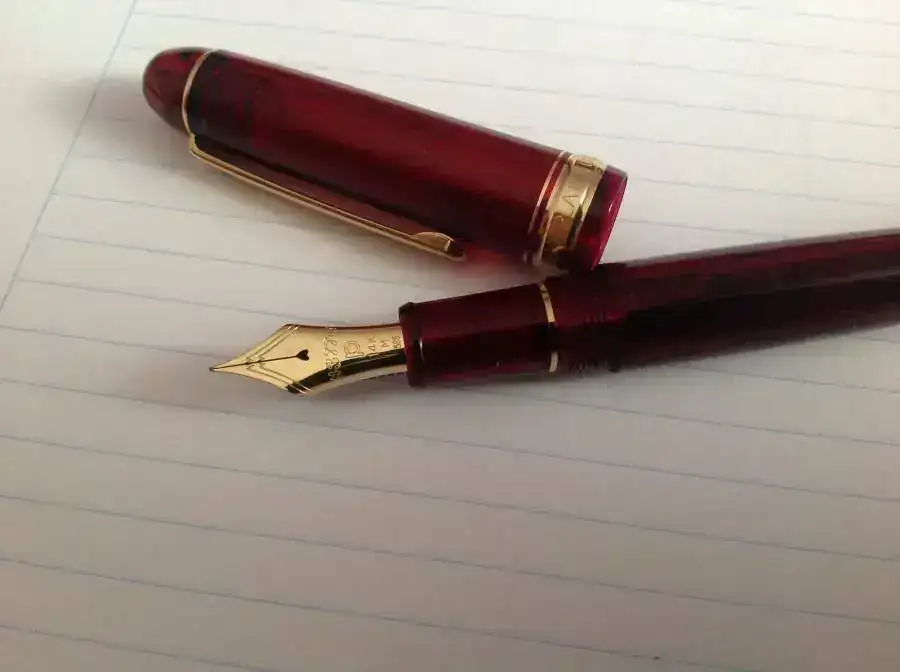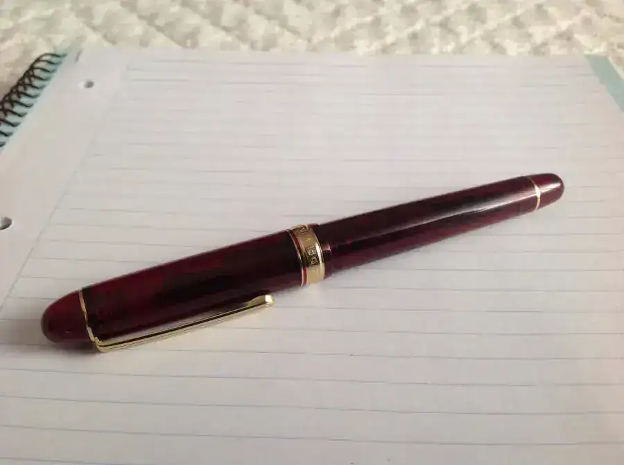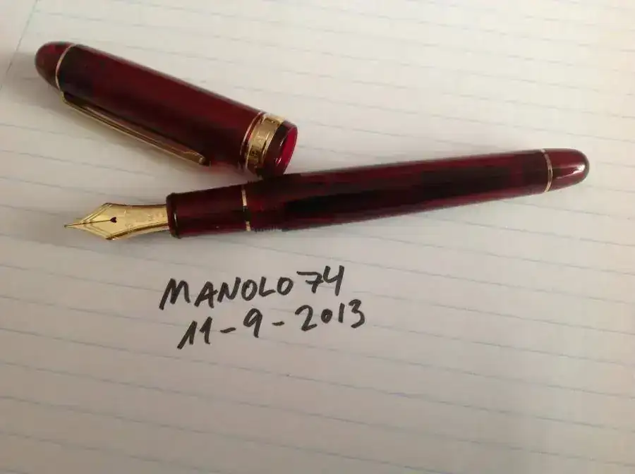 pues unas tienen que salir para que entren otras. Esta es una Platinum, modelo bourgogne, plumín M que ya sabéis que escribe como un F europeo, de escritura perfecta. El cuerpo es translúcido, muy bonito. Ya sabéis que lleva el sistema de cierre slip&seal, nuevo de Platinum, para evitar que la tinta se seque. Está semi-nueva. La envío con caja, convertidor y cartucho.