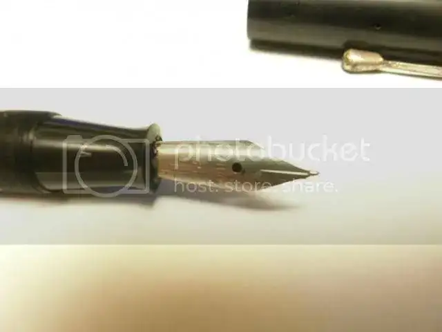 Esta no llevaba pegamento entre el cuerpo y la boquilla, y lo he separado sin problema delante del vendedor. He he mirado dentro y he visto restos de saco y tinta y he pensado: "perfecto, una limpiecita, puesta a punto y como nueva, espero que el plumín sea ajustarlo"