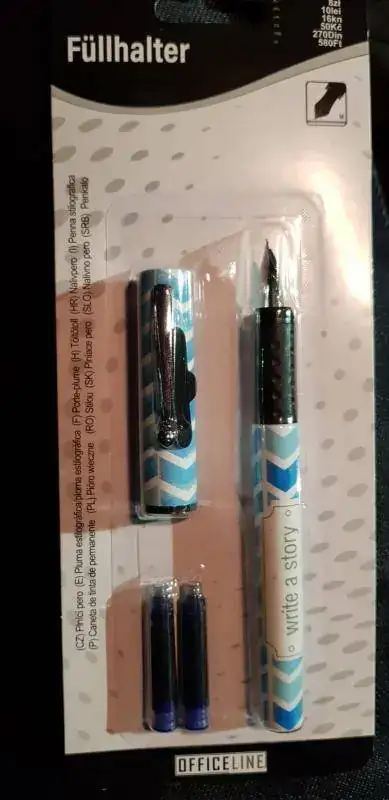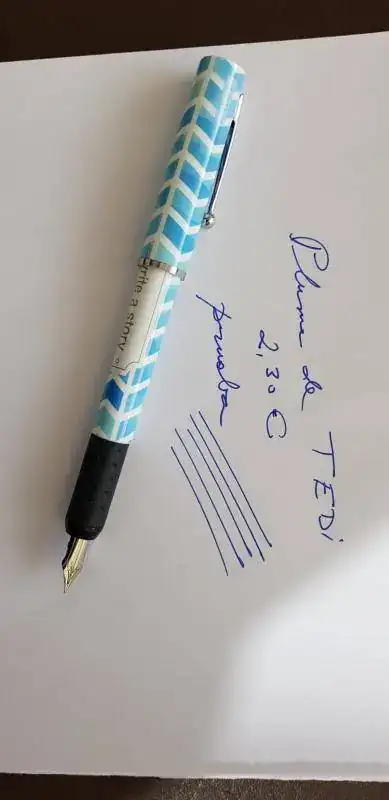 Movido por la envidia de ver la Faber Castell comprada en TEDI de Hook, me acerqué hoy por una tienda de esta cadena. Vi esta pluma por 2,30 €. Trae dos cartuchos. Intenté pinchar el primero y estaba muy duro, por tanto, lo descarté. Probé con el segundo y pude ajustarlo. Aquí os dejo las fotos. De momento, por el precio va bien y tiene la calidad suficiente. El único pero...el plumín rasca un poco, a ver si con el uso suaviza.