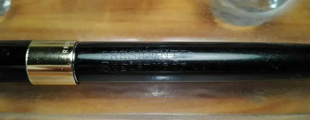 Pongo a la venta esta PRESIDENTE, marca registrada por Doroteo Pérez y Pérez en 1959. El Sr. Pérez, como soberbiamente nos ilustra D. Miguel Huineman en Pluma Hispana, compró a Platinum plumas para marcarlas y comercializarlas een nuestro país como PRESIDENTE. Hablamos pues de una pluma hispano-japonesa. Hubo tres modelos caracterizados por ser plumas esbeltas y finas, de aceptable calidad y acabado, correspondiendo este a la venta al de capuchón de plástico. La pluma está en un estupendo estado para su edad y el precio que pido por ella es de 30 € con envio certificado y número de seguimiento incluido.