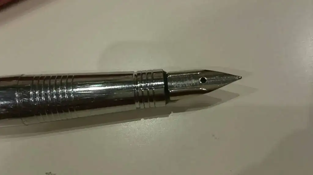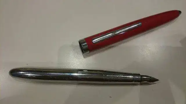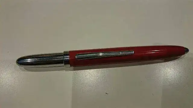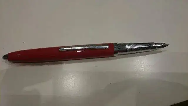 Una pluma que escribe bien pero que no tiene ni una marca que pueda identificarla. Me recuerda un poco al modelo elite, sobre todo a las japonesas. Ni publicidad ni marca en el plumin de acero. El cuerpo es metal con laca.