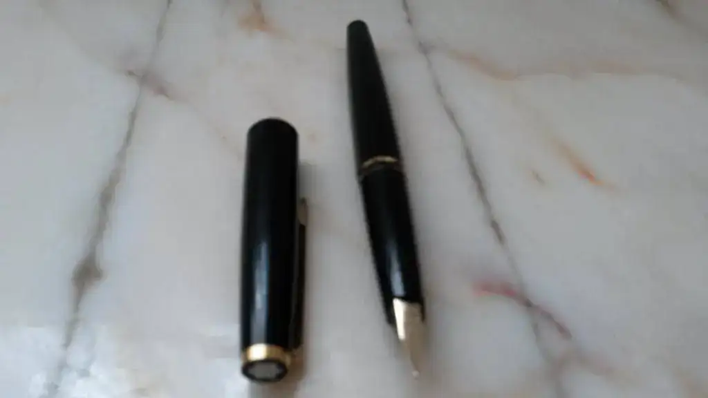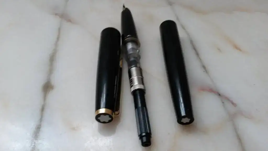 La pluma parece ser una M.B. 221. Fue un regalo, la cargué la usé para ver como era eso de escribir con pluma estilográfica y tras limpiarla la guardé y desde entonces (unos 30 años) duerme el sueño de los justos en un cajón. Está en perfecto estado (a pesar de las malas fotos) y viene en su caja original. Si fuera un reloj lo calificaría de NOS.