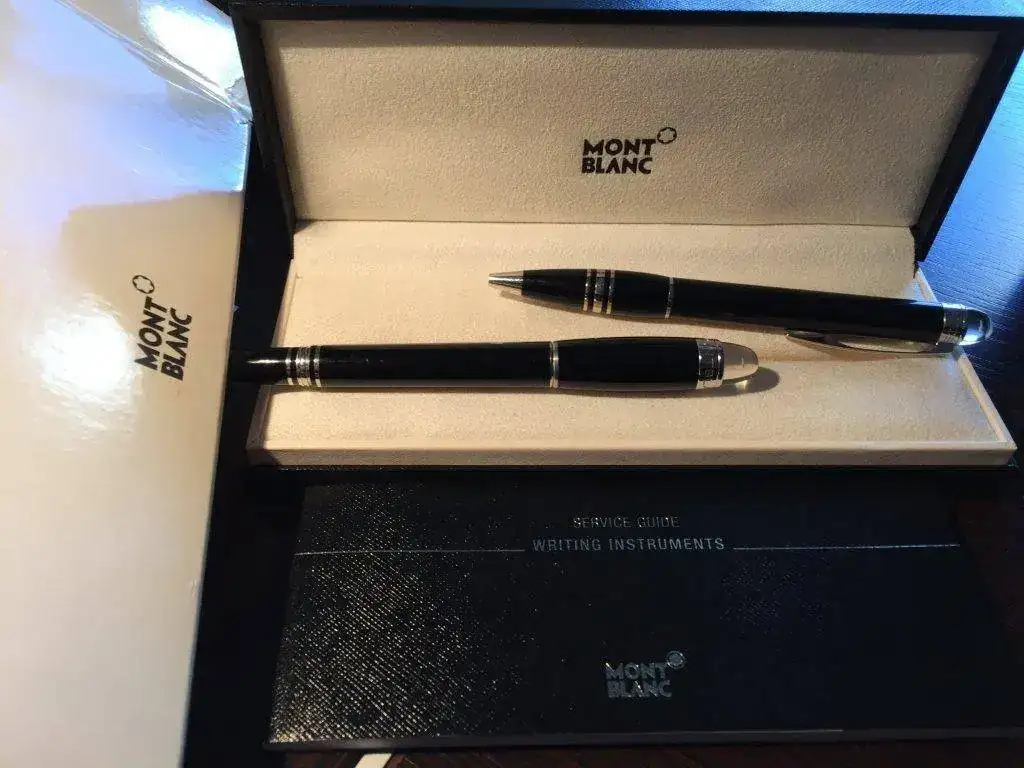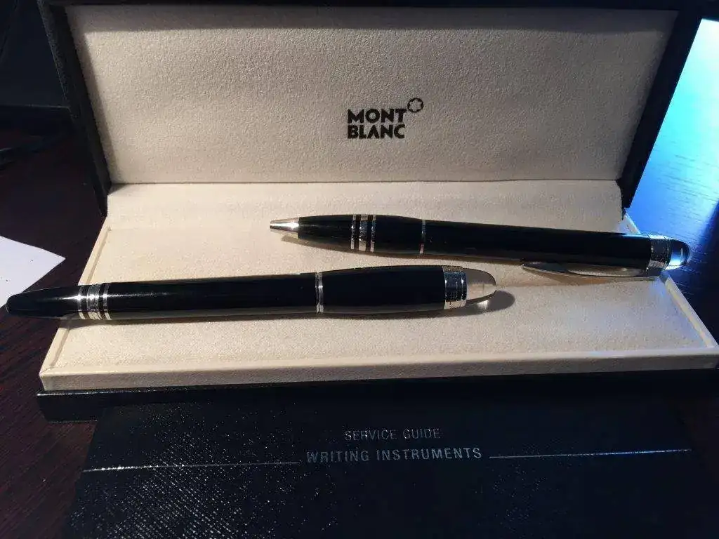 Vendo esta pluma y boligrafo Montblanc Starwalker. Ambos se encuentran en muy buen estado, pero han sido usados. Hace tiempo que estan guardados, pero se han usado. La pluma tiene el plumin perfecto. No se que trazo es, no encuentro su caja. La etiqueta de la fecha esta hecha con ella.