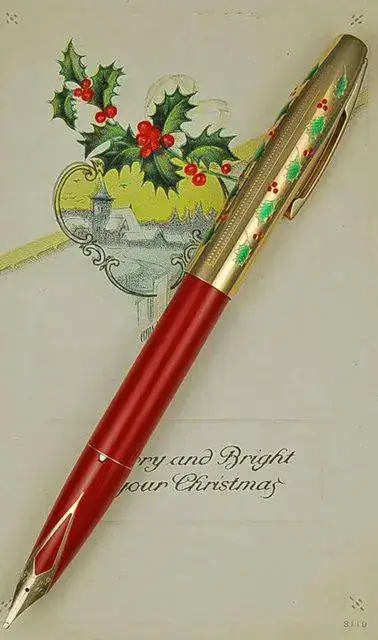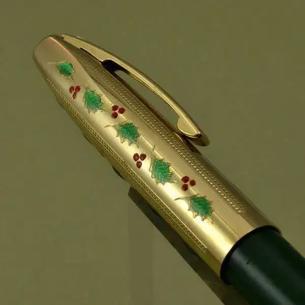 Comenzaremos con todo un clásico como es la Sheaffer Christmas Imperial IV Touchdown, decorada en su capucha con motivos de hojas y frutos de acebo grabados y lacados en color y al menos en dos colores de barril, rojo y verde oscuro.