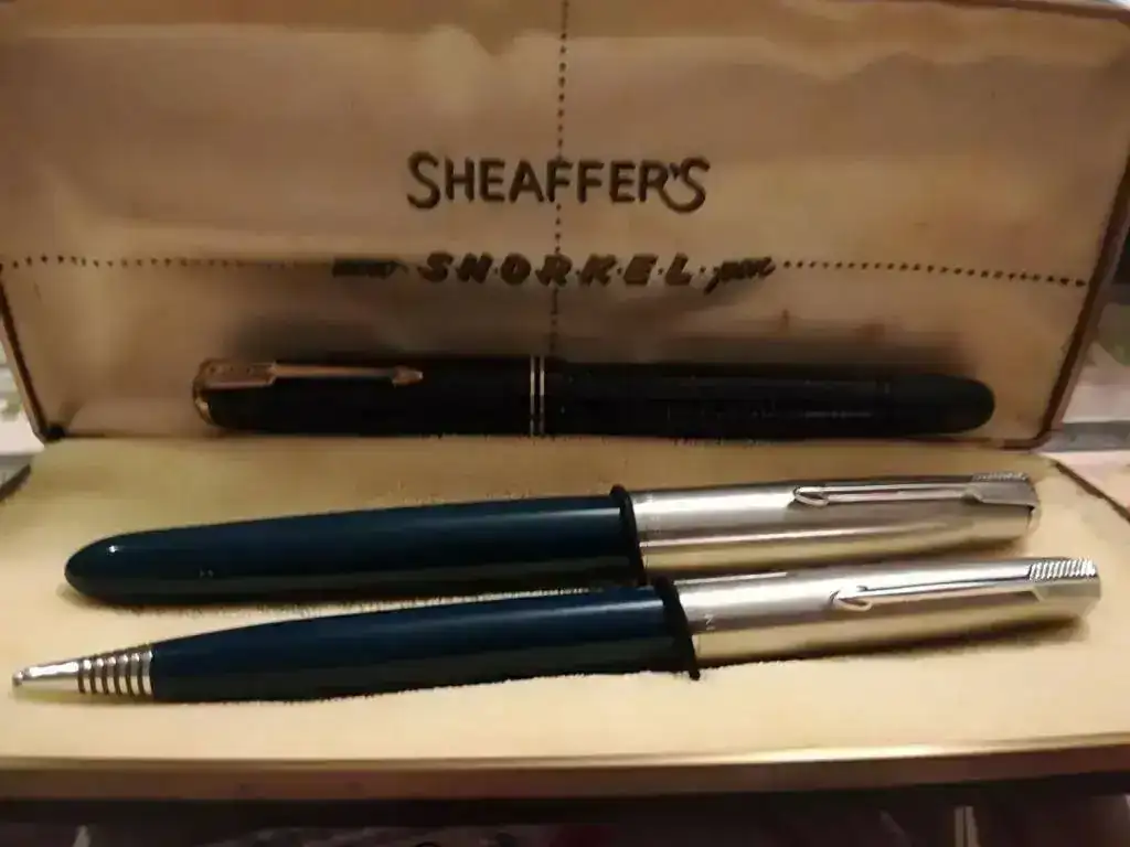 Pues coincido con tracker: En primer plano tienes un juego de pluma y portaminas parker 51 en lustraloy (acero) a los que les falta la caja, pues en la que están es de otra marca (de un juego de sheaffer snorkel). Al fondo una parker vacumatic, me atrevería a decir que Junior (por los dos anillos que luce el capuchón). Estupendos instrumentos.