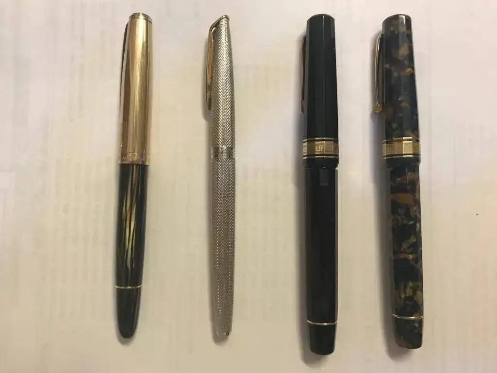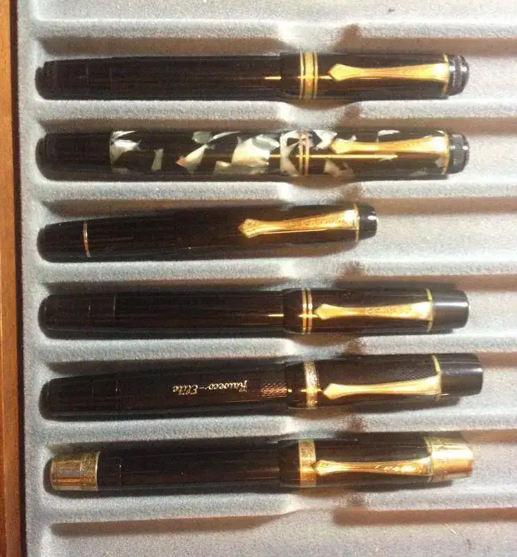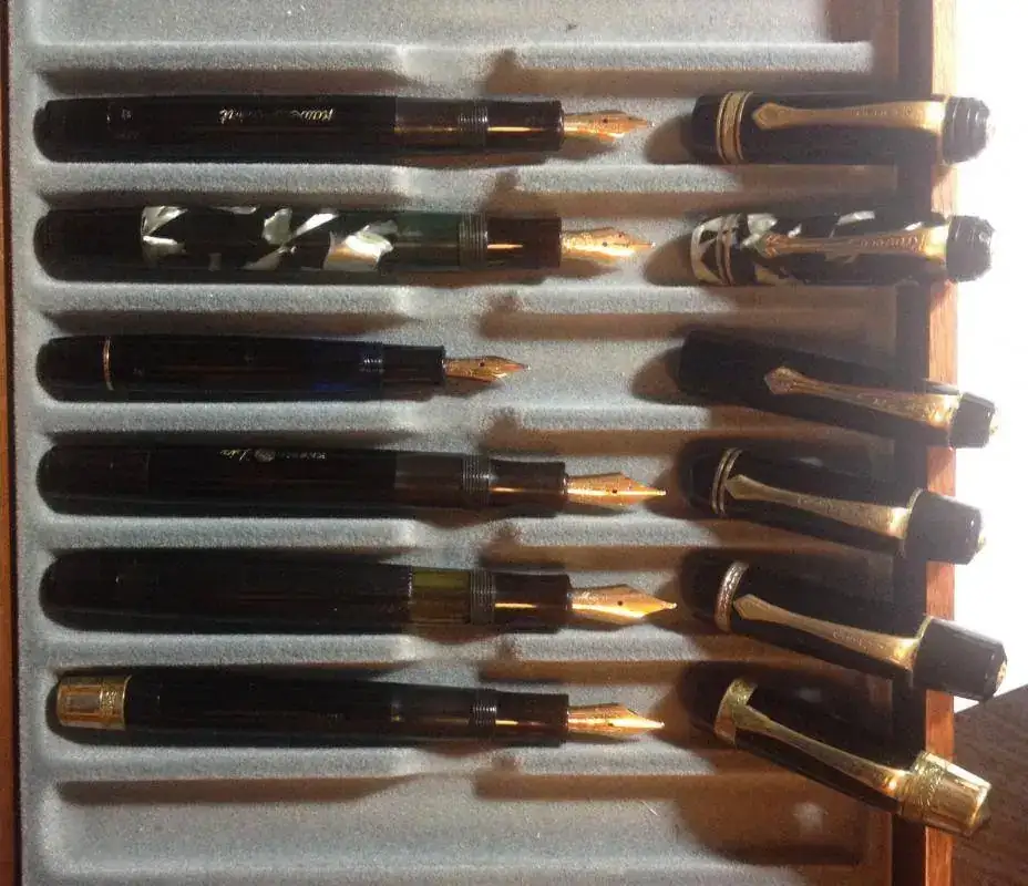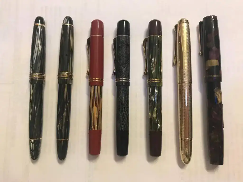 Un par de Montblanc 142 antiguas, 3 Pelikán 101 N, otra Pelikán muy bonica; una blackbird de celuloide antigua.