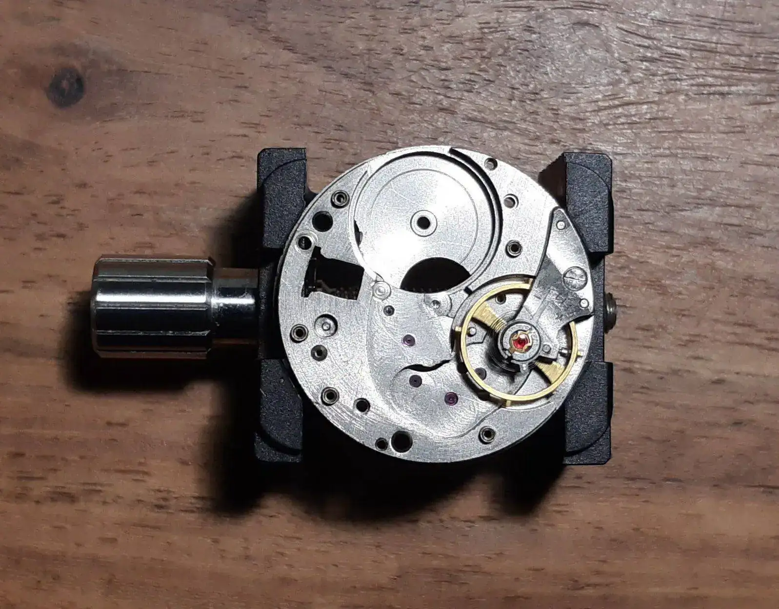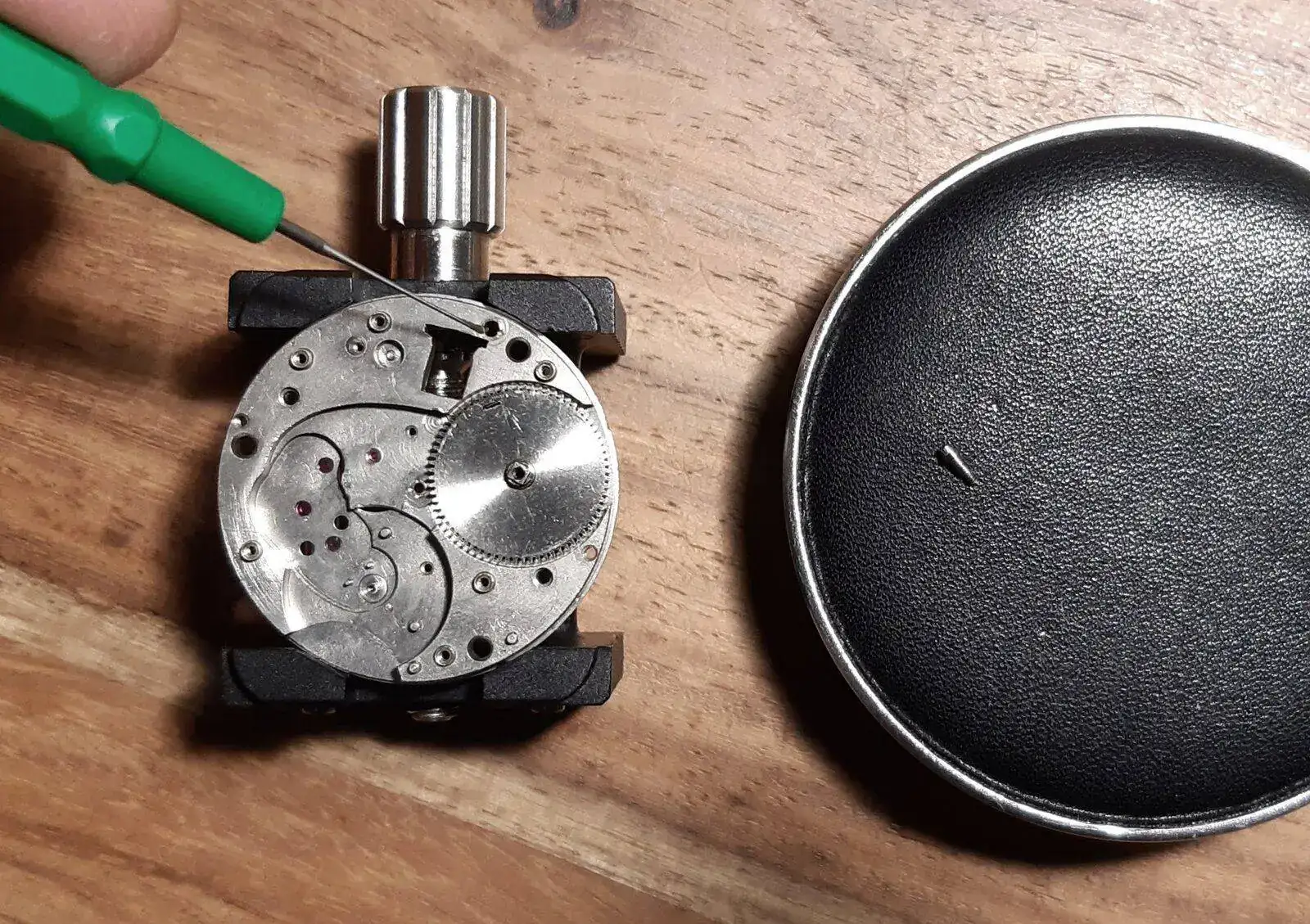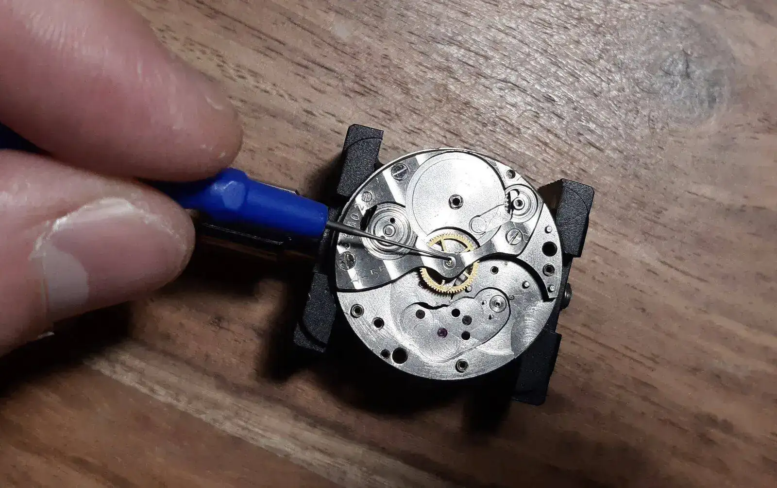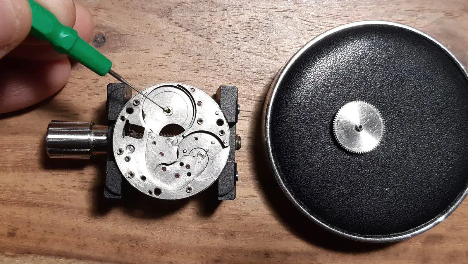 Damos la vuelta al movimiento, lo ponemos en un portamáquinas y aflojamos este tornillo para retirar el áncora: