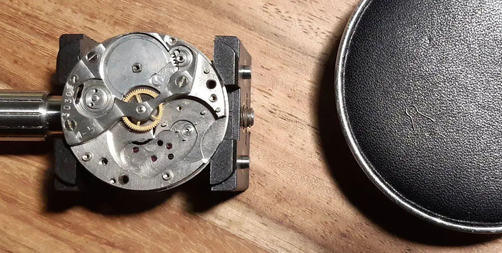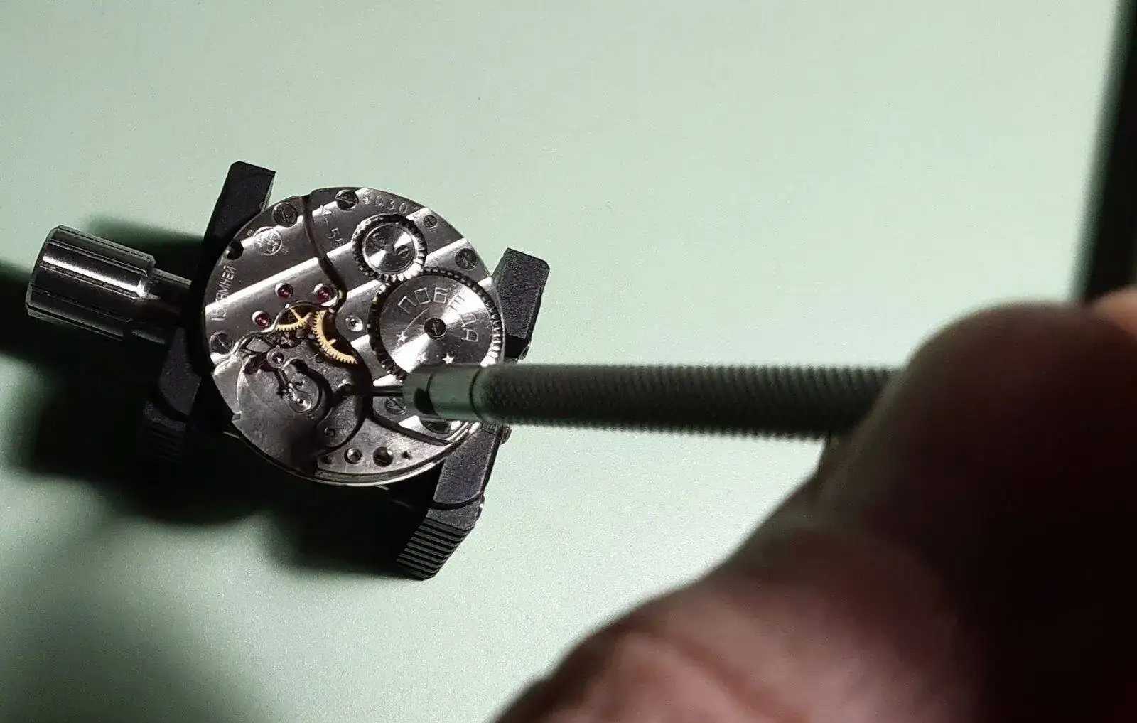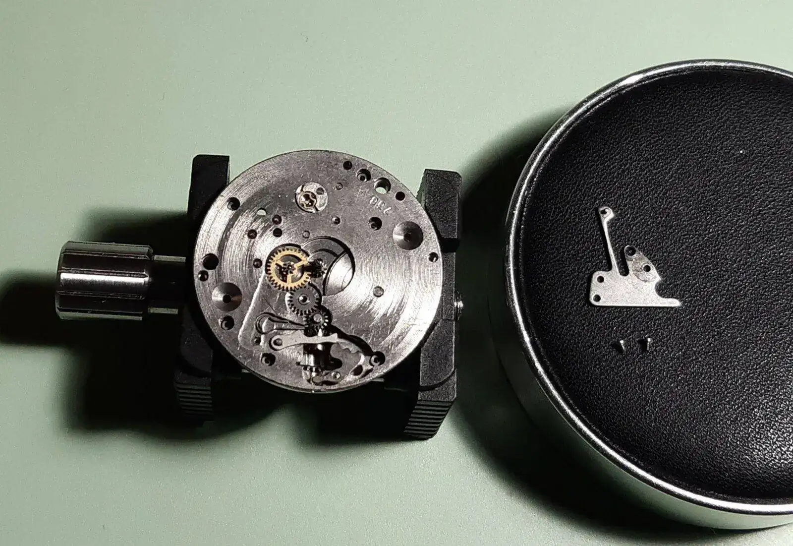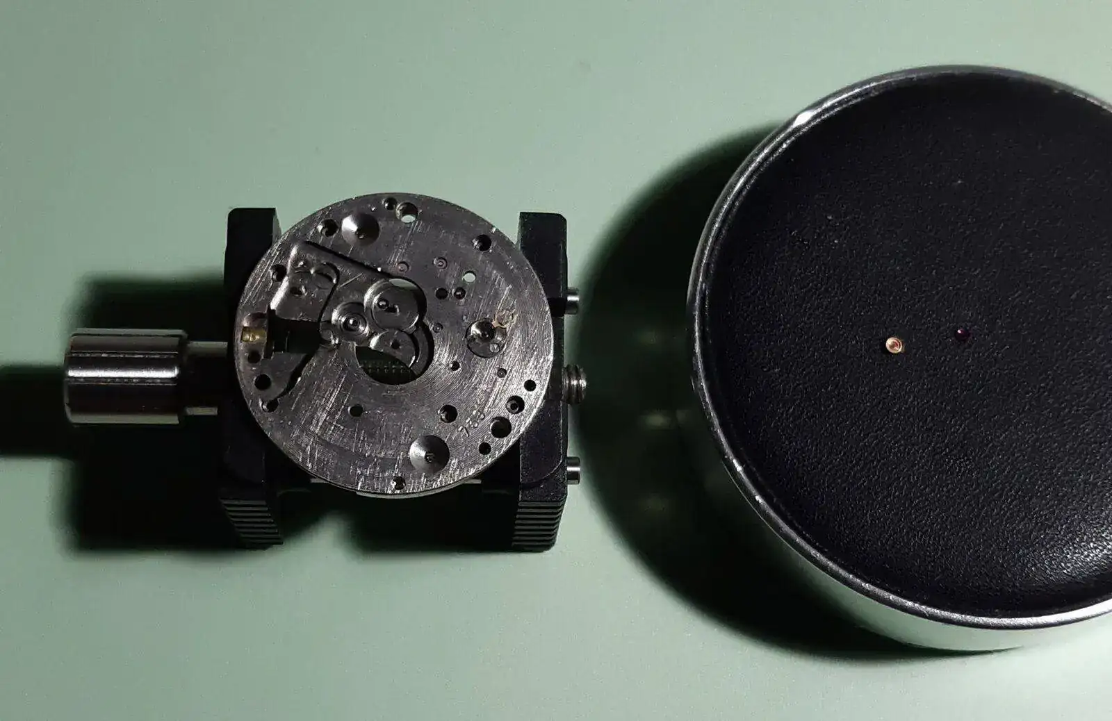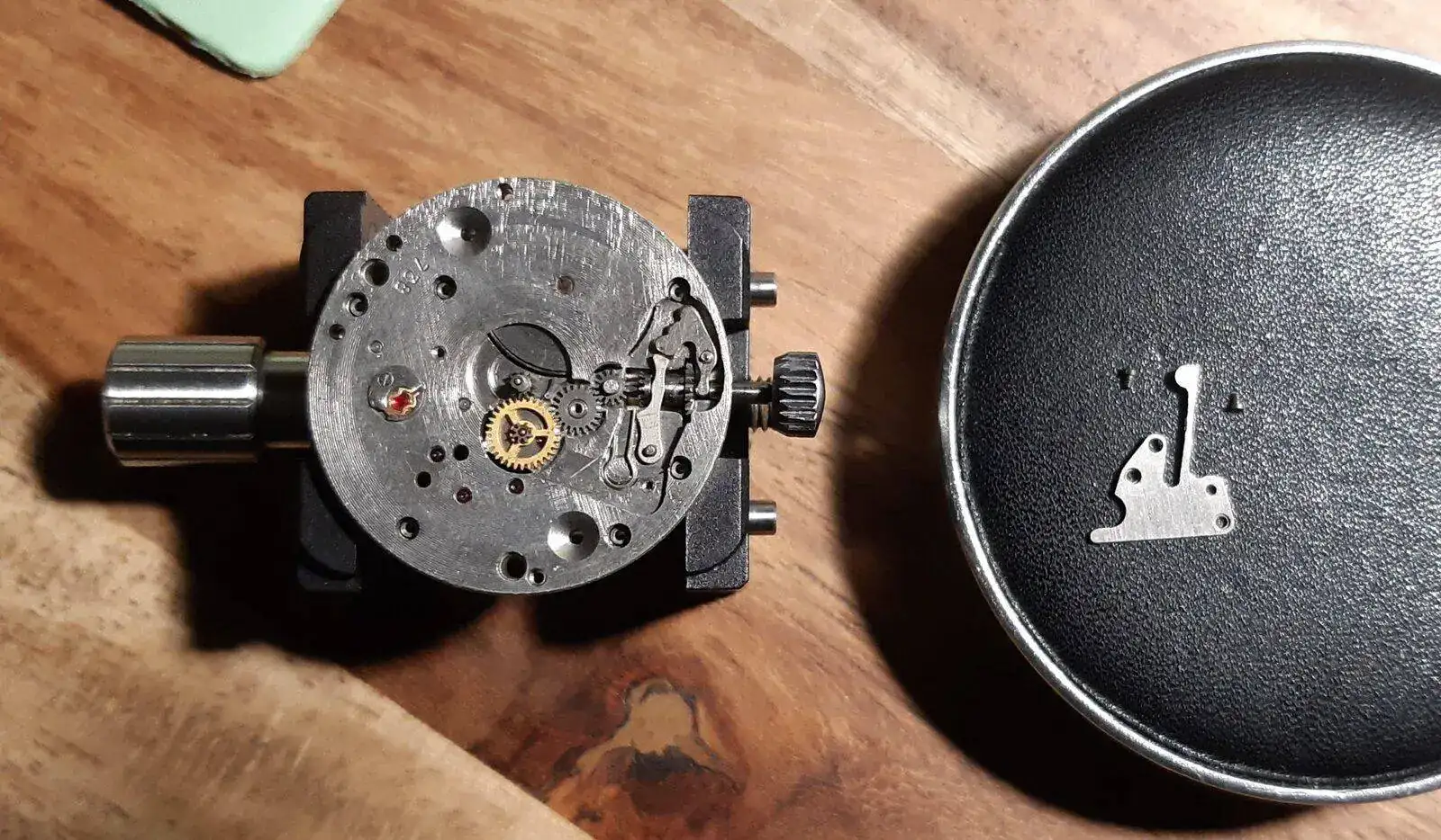 Damos la vuelta al movimiento, lo ponemos en un portamáquinas y aflojamos este tornillo para retirar el áncora: