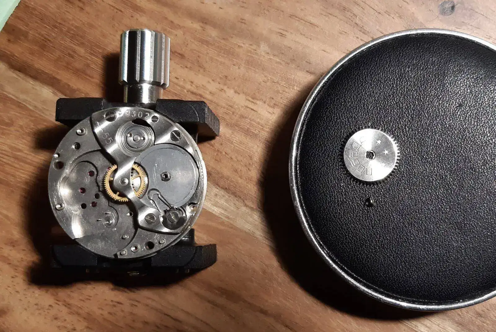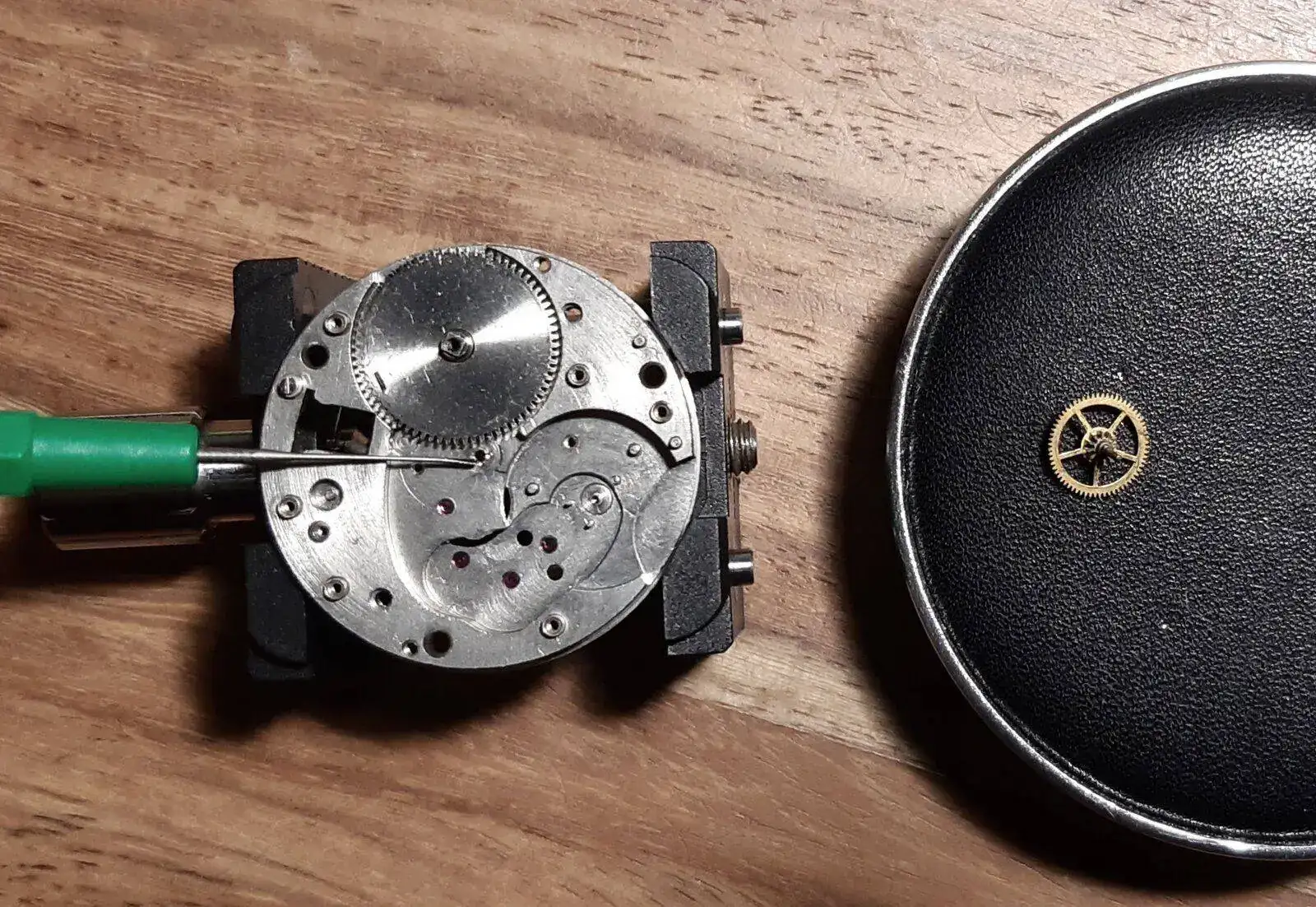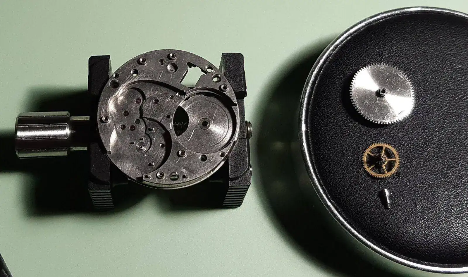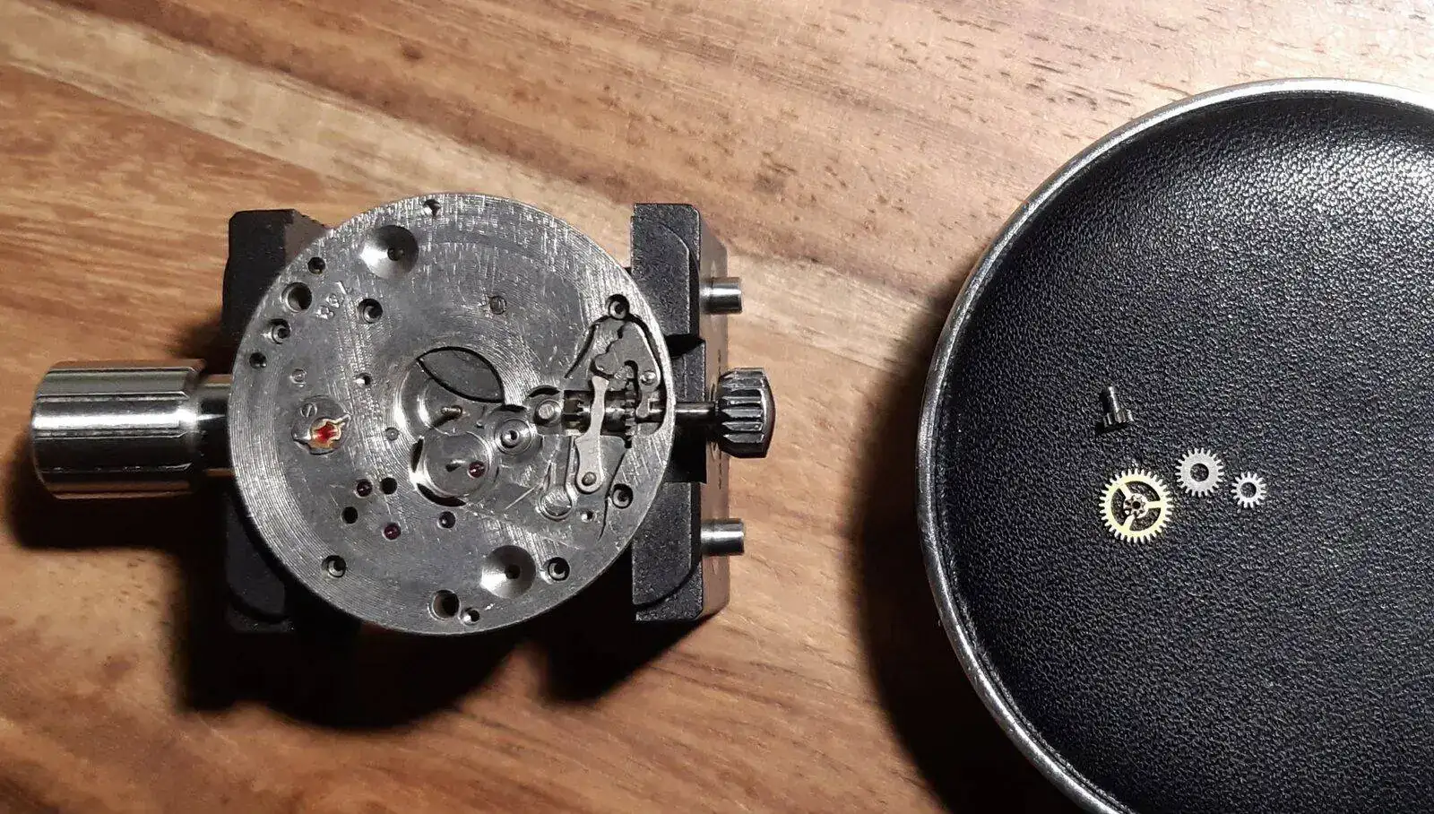 Primero retiramos las tres ruedas, luego el muelle, luego la leva y el remo, la rueda que envuelve la tija y por último el cañón de los minutos: