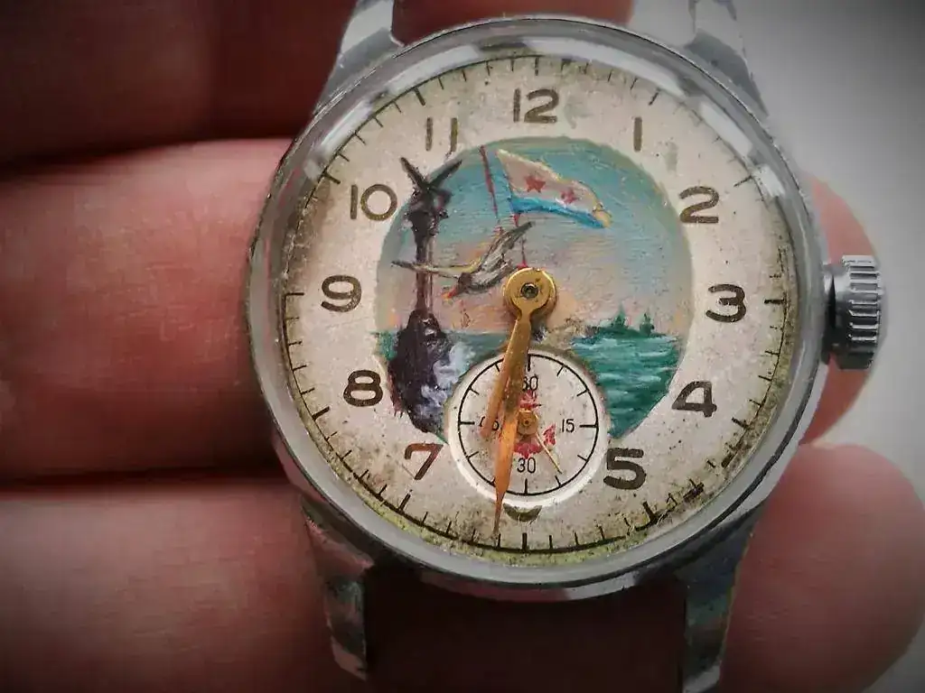 Este reloj no es especialmente raro, es un Pobeda de la primera fábrica de relojes de Moscú, e incluso las manecillas no le corresponden.