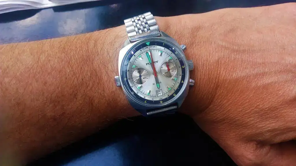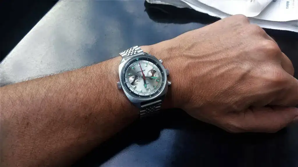 La esfera es de tonos plateados con el efecto rayos de sol, con los índices aplicados, fechador a las 6h, segundero a las 9h y contador cronográfico de 30m a las 3h. Tiene una escala telemétrica y un bisel interno para un segundo uso horario. el color de las agujas del crono y el color verde del tritio le dan un aspecto muy deportivo, que en mi opinión se complementa armoniosamente con los tonos plateados, según infiere la luz. La lectura de las subesferas no es fácil, según incida la luz y los caracteres de mi unidad están en alfabeto latino, ya que estas unidades eran destinadas para la exportación al mercado mundial.