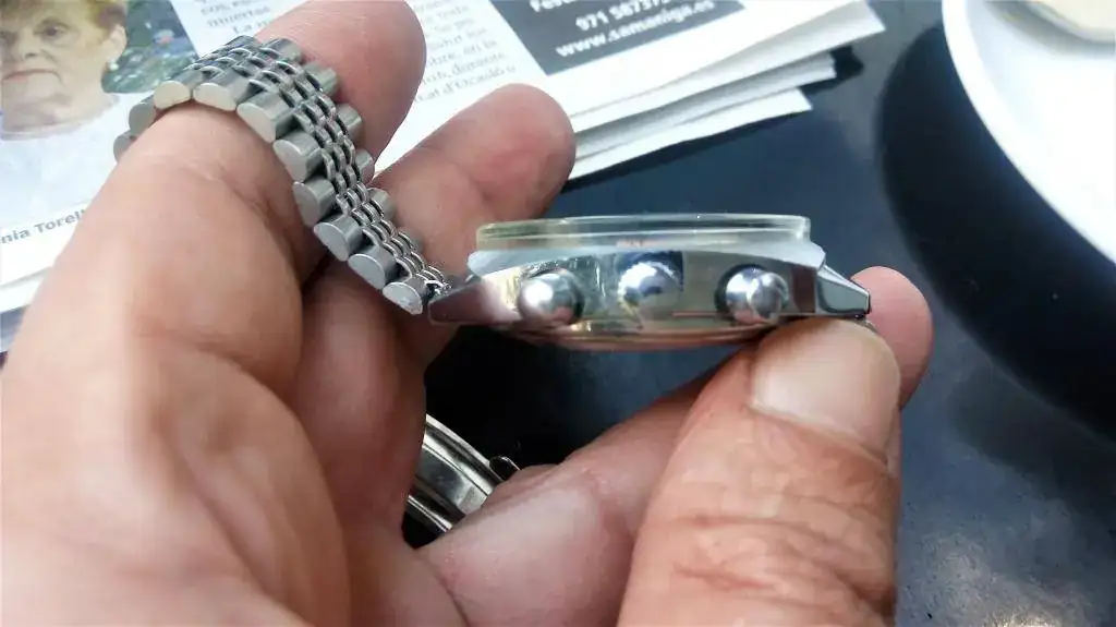 La caja es cromada, aunque yo juraría que es de acero, si no es así, el cromado es excelente; con un cepillado tipo de rayos de sol; es liviana y bastante cómoda. Sus dimensiones son discretas, 38mm sin coronas, 45mm con las dos coronas y con una altura, contando el plexi de unos 13mm. El ancho de asas es de 18mm. En resumidas cuentas un tamaño comedido, discreto, que no se hace pequeño en la muñeca, pues el conjunto esfera bisel mide aproximadamente 36mm.
