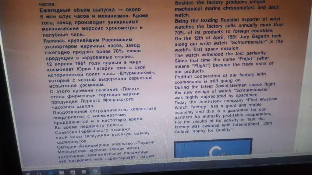 No podría finalizar este hilo sin hacer una somera referencia a la historia espacial de esta versión civil. Fueron muchos los cosmonautas que lo utilizaron durante sus viajes y bien se encargó poljot de presentarlo como un intangible (foto extraída de un catálogo de 1992)