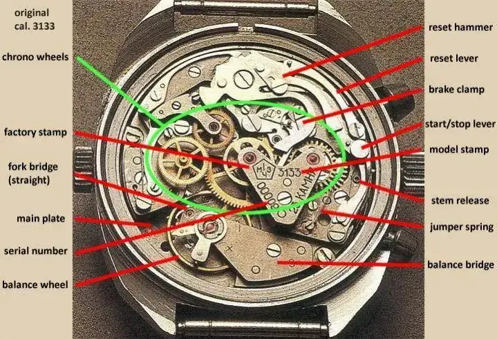 Some of the initial modifications made by Poljot to the cal. 7734 included a taller main plate, third wheel plate with jewel bearing, jewelled chronograph gears, smaller and faster running balance with shock protection, and quickset date mechanism. Curiously, the initial version of the Poljot cal. 3133 utilized the older version of the 7733/34 reset function(hammer, fly-back lever) that was produced between 1968-1971.