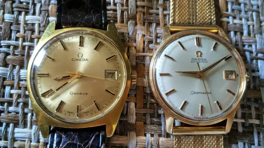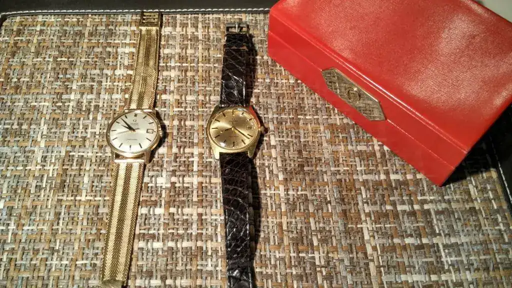 La siguiente es una que me vino por herencia. Los dos setenteros son iguales, con una caja estrellada muy curiosa, y con unos diales irisados de unos colores bien vistosos, y que van cambiando según les da la luz. Azul el de la izquierda, y marrón el de la derecha. Los dos Orient Crystal llevan ya su brazalete original.