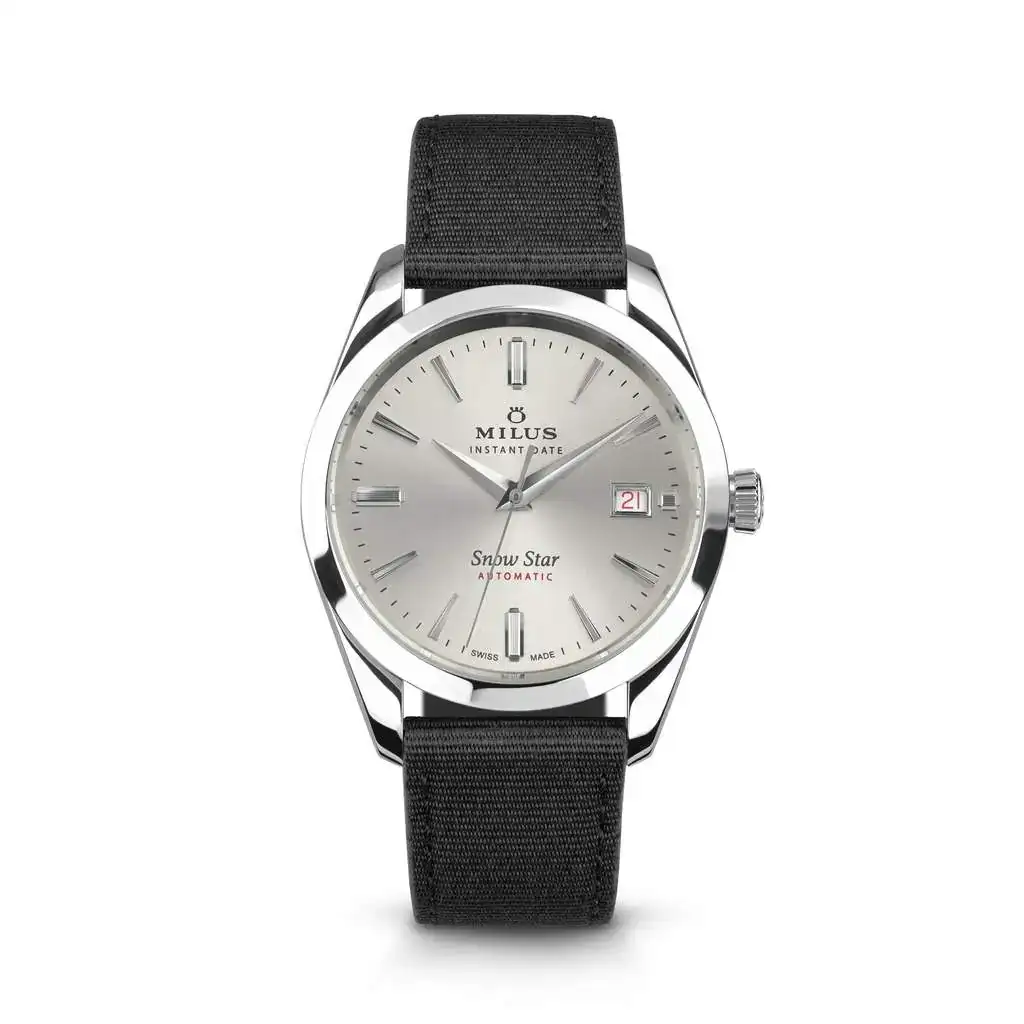 Carga automática, calibre ETA 2892A2 (TOP), 21 joyas, reserva de marcha de 42 horas, ventanilla de fecha a las 3 en punto. Puentes perlados, tornillos azules, rueda oscilante calada con logo Milus.