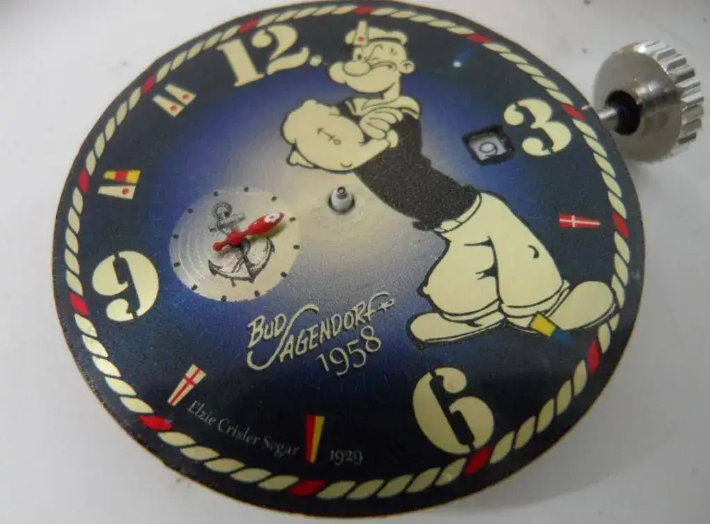 El reloj tiene la firma original del Bud Sagendorf, el año de diseño del personaje y entre las 7 y las 8 una anotación del creador del personaje original y la fecha de creación ( 1929 )