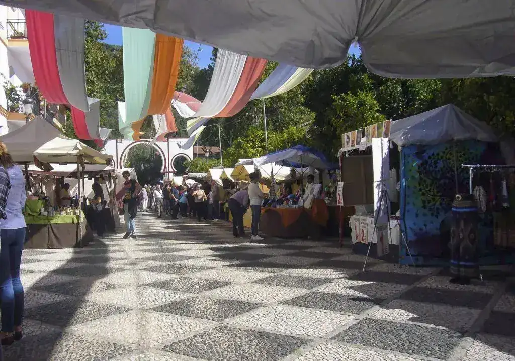 Nada más entrar, al andusquear por sus calles, nos topamos con mucha gente ataviada de época para la ocasión lo que le da un punto de viaje al pasado en el tiempo. También multitud de puestos con artesanías de arabescos, pastelería "mora", de indudable atractivo en olores, sabores y formas, cacharrería varia y artesanías de cueros y repujados; y todo ello en sus calles cubiertas con coloridas lonas/visillos que apaciguan el insoportable castigo del Lorenzo, que ayer estaba escondido y hoy martiriza a quien se pone debajo sin protección. Ha sido una muy agradable visita.