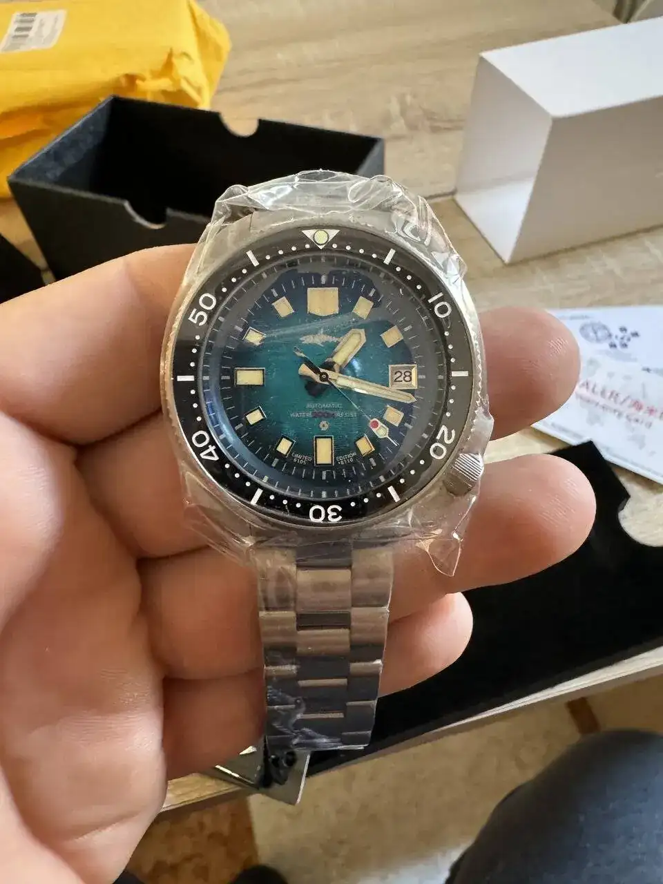 Hola familia, finalmente después de casi un mes de espera me llegó mi chinito de titanio para uso diario. Y para mi sorpresa me han enviado un edición limitada . Decir que en persona el reloj gana muchísimo y con unos acabados de una calidad impresionante para el precio que pagué. ( con marcas con más historia en un rango de precio de 400/600 euros no tiene nada que envidiar )