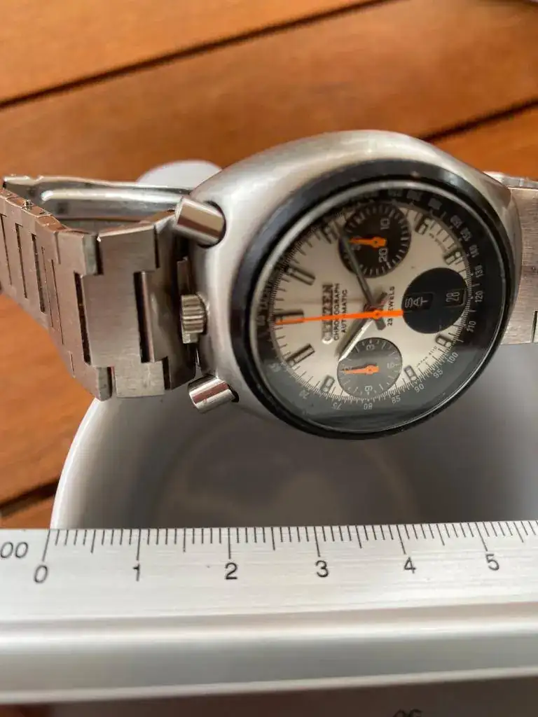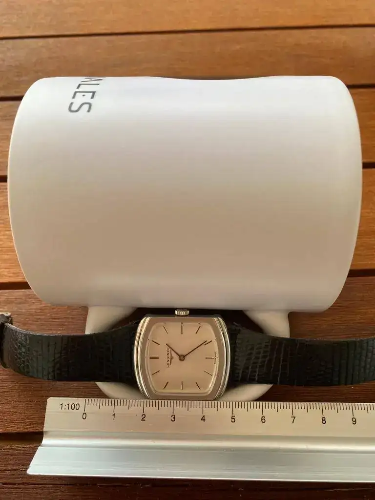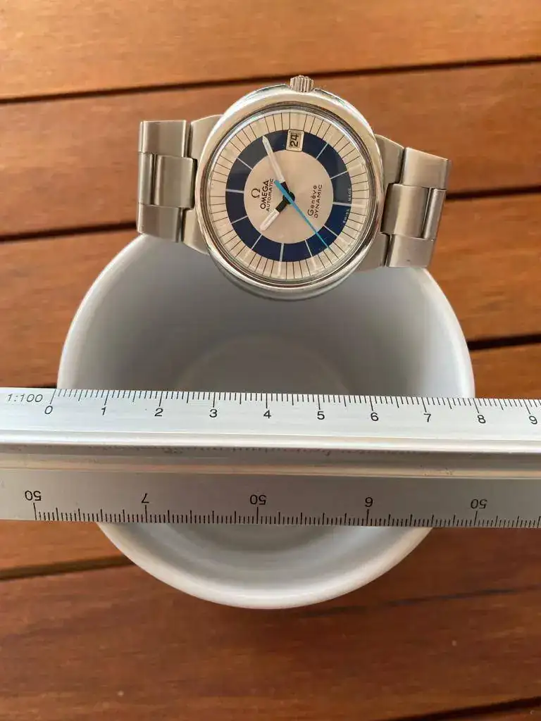 Diámetro generoso 82 mm y además blanco, lo cual, parece más grande en muñeca. Combina con todo, de traje o de sport. Me encanta.