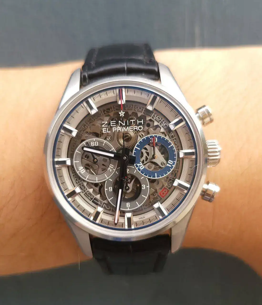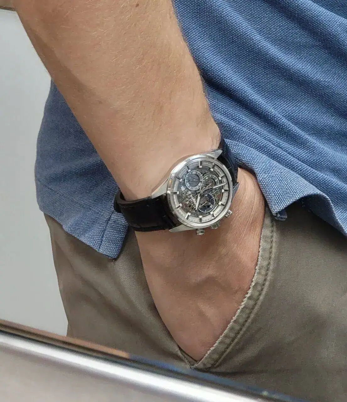 Pero aunque no sea perfecto, me encanta. Fue amor a primera vista. Todos los que he puesto arriba tenían algun fallo que me desalineaba todos los chakras y que me impidió decidirme en su momento. El Grand Seiko SBGE255 no tenía marco en el fechador y los índices de las 3, 6 y 9 no me convencían, el Snowflake me parecía que era demasiado formal y apenas iba a salir de la caja, el Omega Aqua Terra tenía el fechador en todo el medio del dial, el JLC Master Control me flipaba por movimiento y origen, pero estéticamente me dejaba frío, Tag Carrera ya tengo uno, el bisel del Citizen The Citizen no me gustó un pelo en persona, y el Sinn 903 no se podía ver en directo y además tiene un tiempo de espera de 18 semanas... Pero este Zenith fue verlo en foto y encantarme, y en cuanto fui a verlo en persona supe que sería el elegido.