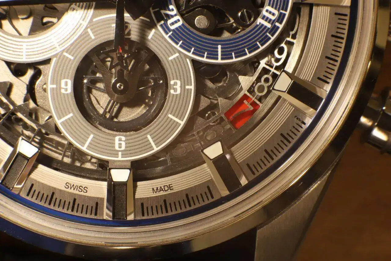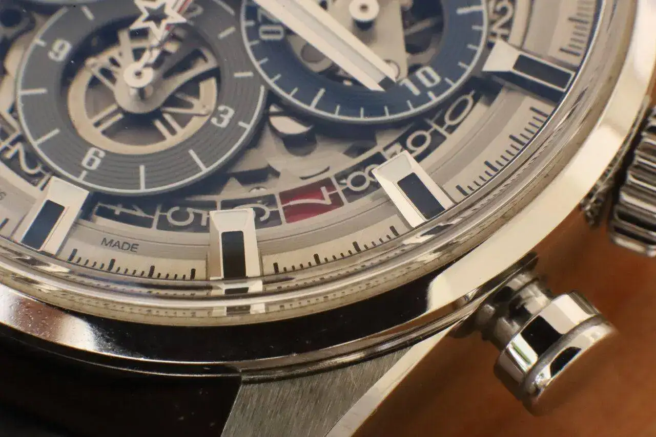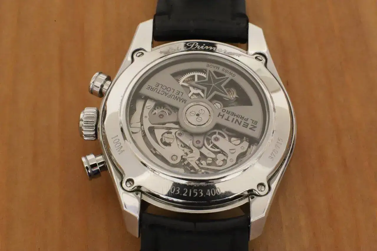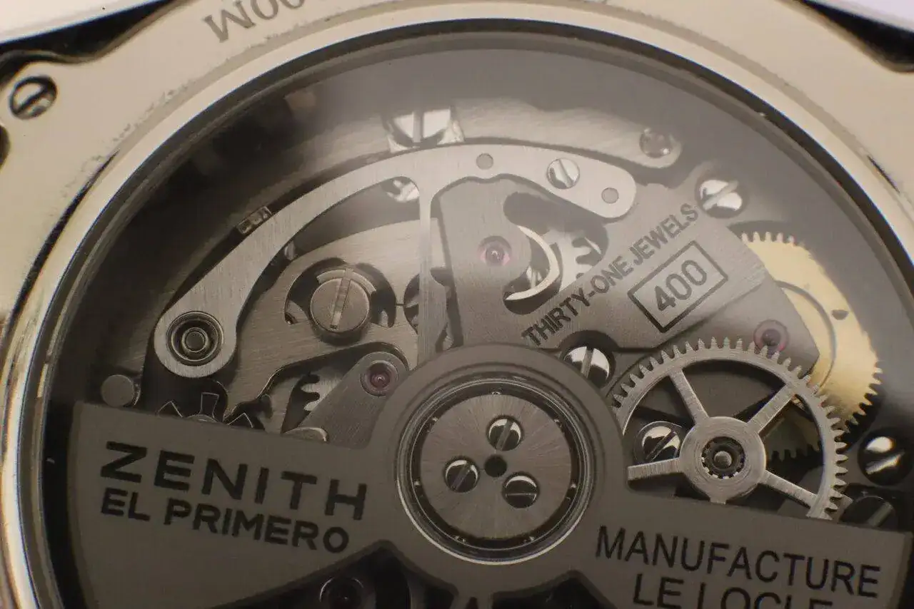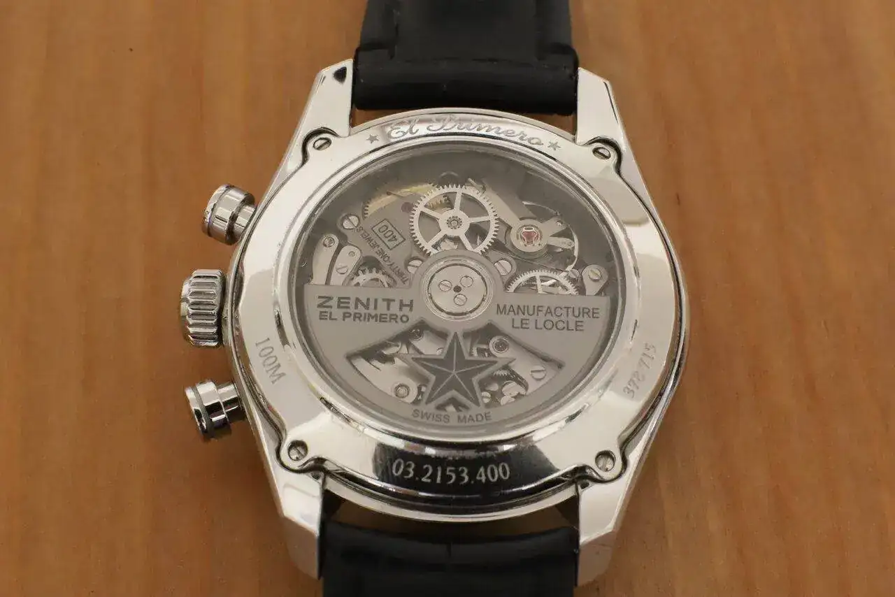 Yo que soy tremendamente friki de los calibres y todo lo mecánico me encanta el poder ver ambas caras del movimiento El Primero 400. Porque además es el movimiento tal cual, ya que el reloj no está esqueletonizado sino que solo tiene un agujero por dial en vez de ser sólido. Me encantan las proporciones, el tacto de los pulsadores, el ruido frenético del escape, los acabados... En fin, contento como unas castañuelas.