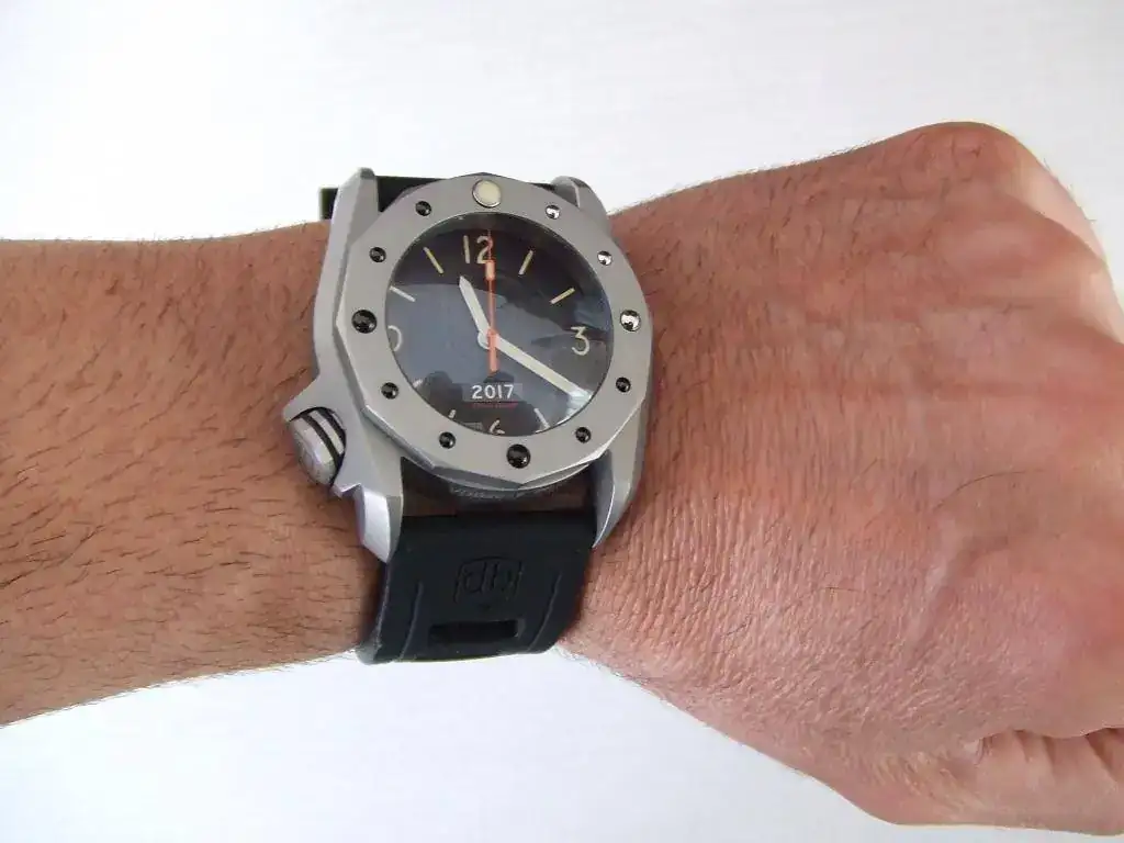Es un reloj de 45mm de caja por 18mm de grosor con acabado arenado de acero y limitado a 60 piezas. También lo hay en bronce.