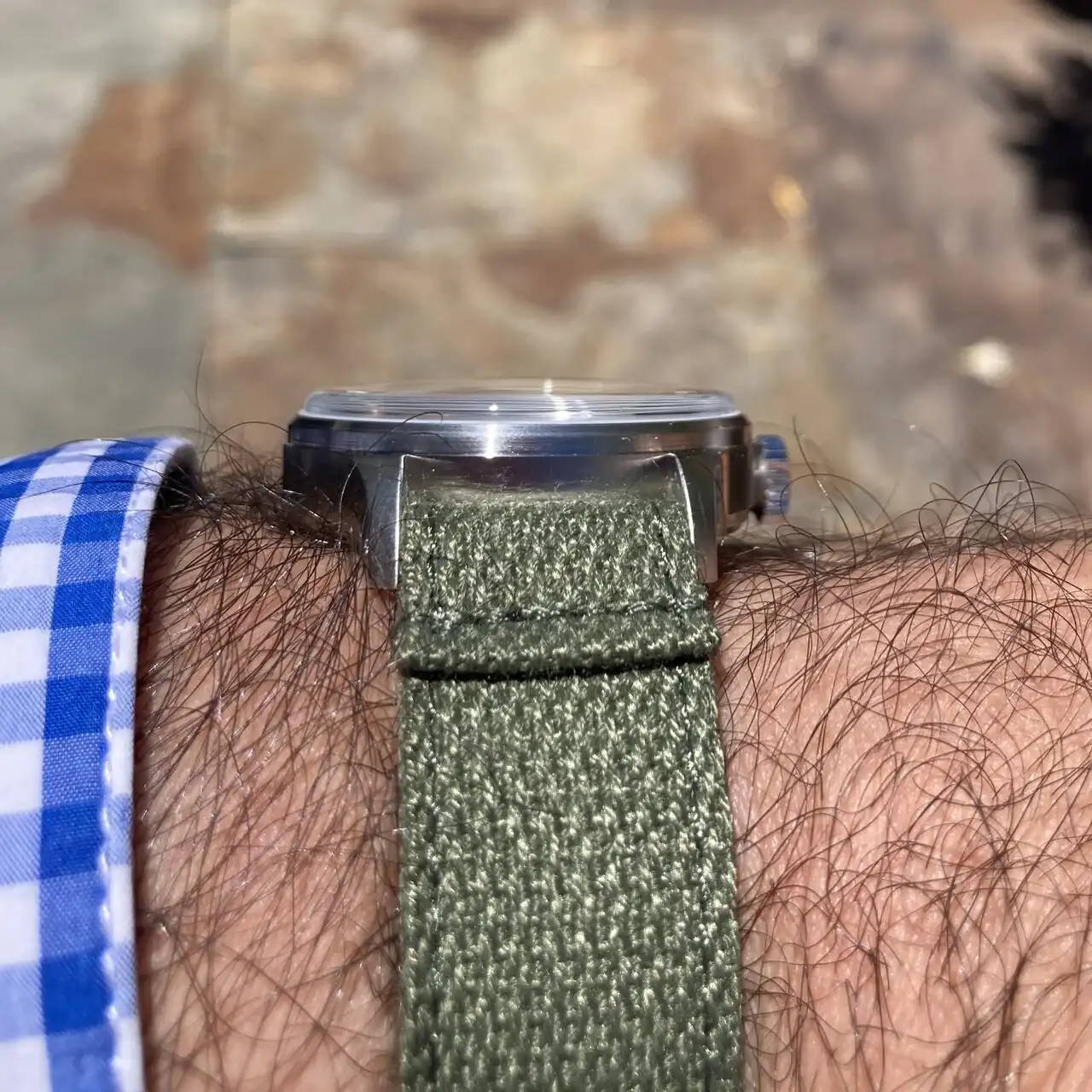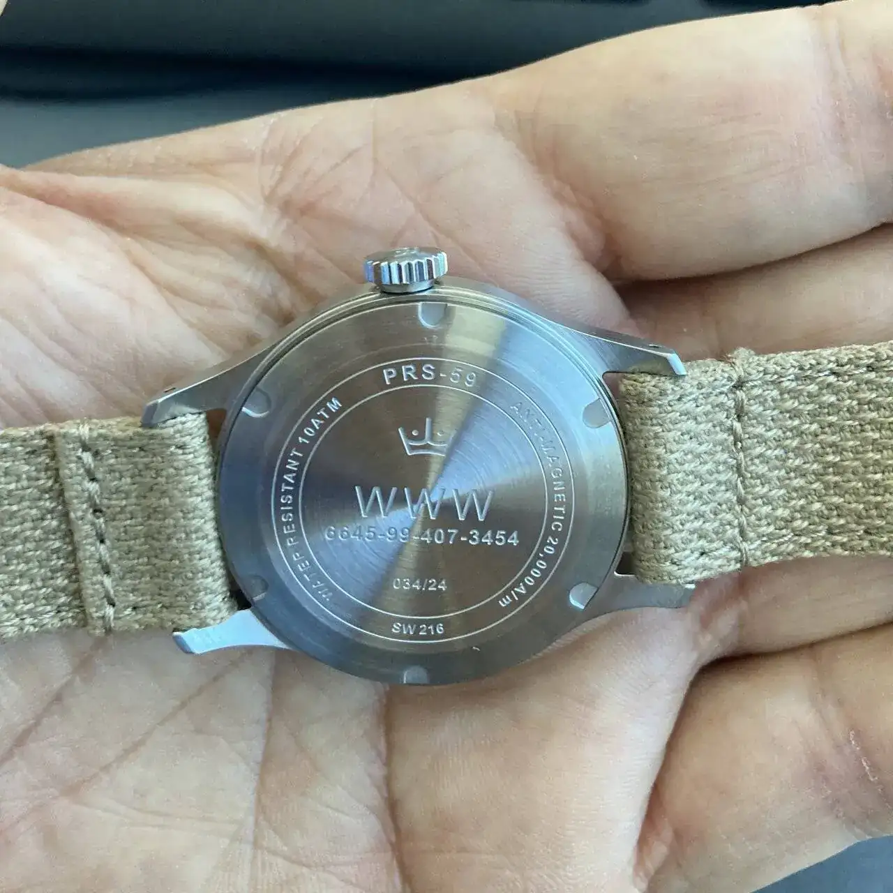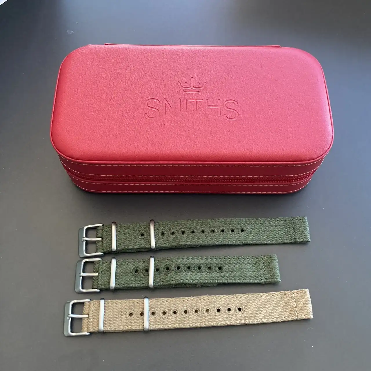 Como de costumbre, viene con su estuche de viaje para dos relojes, y 4 correas de algodón de estilo militar (en dos colores, beige y verde militar, y dos tamaños de longitud, ahora lo he cambiado a la beige más corta).