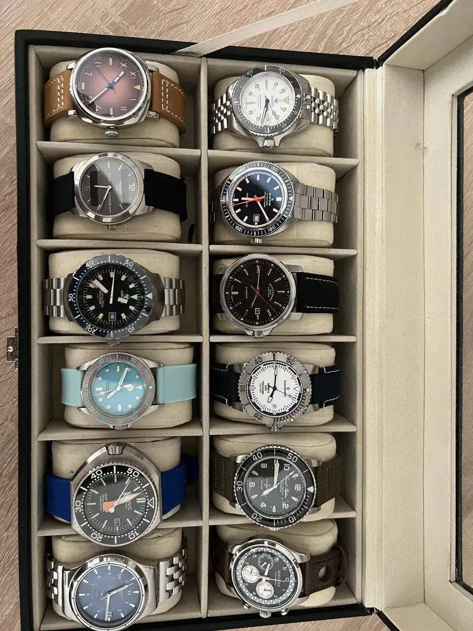 Bueno al lio, enseño mi caja a falta de el crepas hudrographer, crepas batiscafo, el scafo mark 1, orient mako xl,steeldrive minituna,cyga design serie z titanium, seagull crono, en fin a falta de unos cuantos que no tengo en mi domicilio actual, el tema es que me gustaria reestructurar esta caja y a ver si me planteo ya de una vez vender algun reloj o cambiarlo por algo de un estilo diferente, sinceramente no me animo.