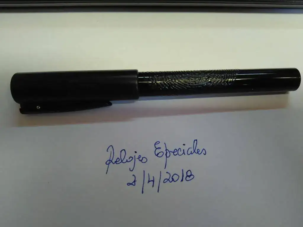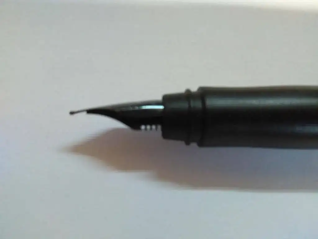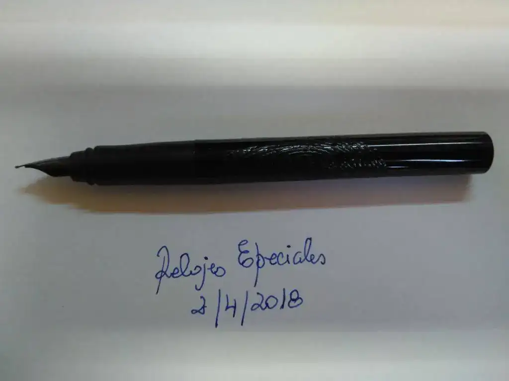 No soy fan de las estilográficas Faber, el caso es que nunca las he probado, pero me ha sorprendido muy gratamente que con un material plástico, sus 13 cm cerrada, 12,5 sin capuchón, 16 cm posteada y 1 cm de diámetro en el barril, el plumín color carbono con punto F (fijaros en esa leve curvatura que posee) me resulta el que siempre hubiera deseado en otras de mayor prestigio y, curiosamente, mas fino que un EF de una Pelikan M605 Ruby Red que tengo.