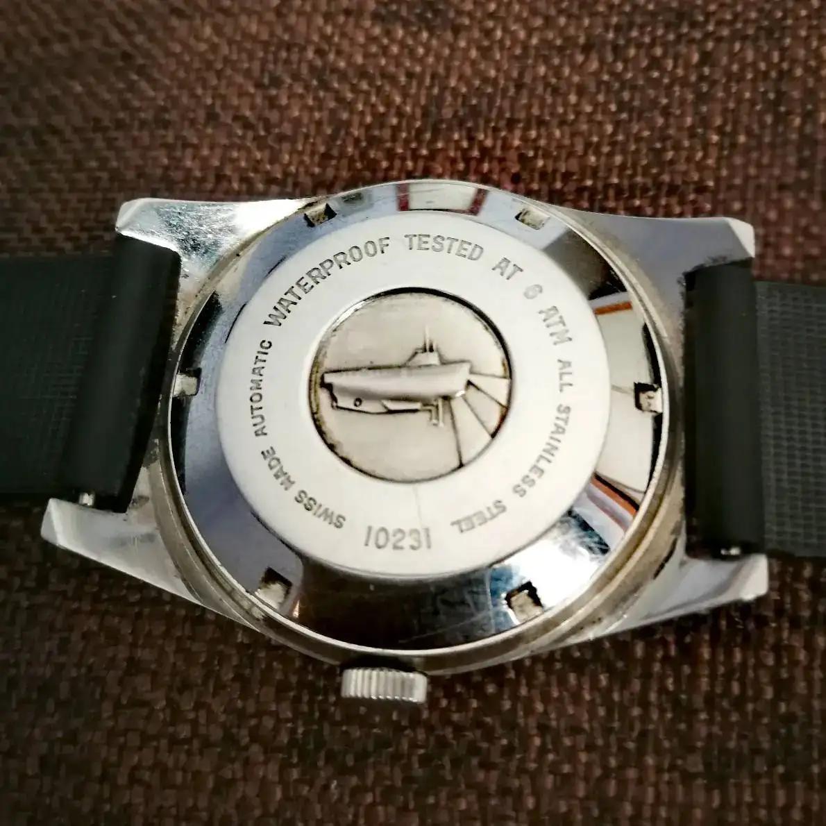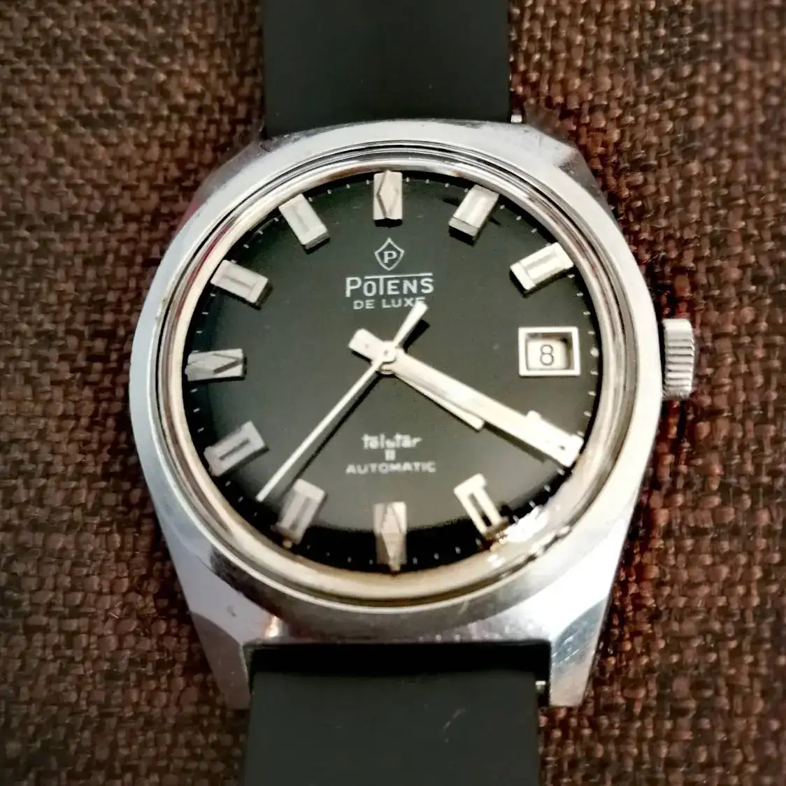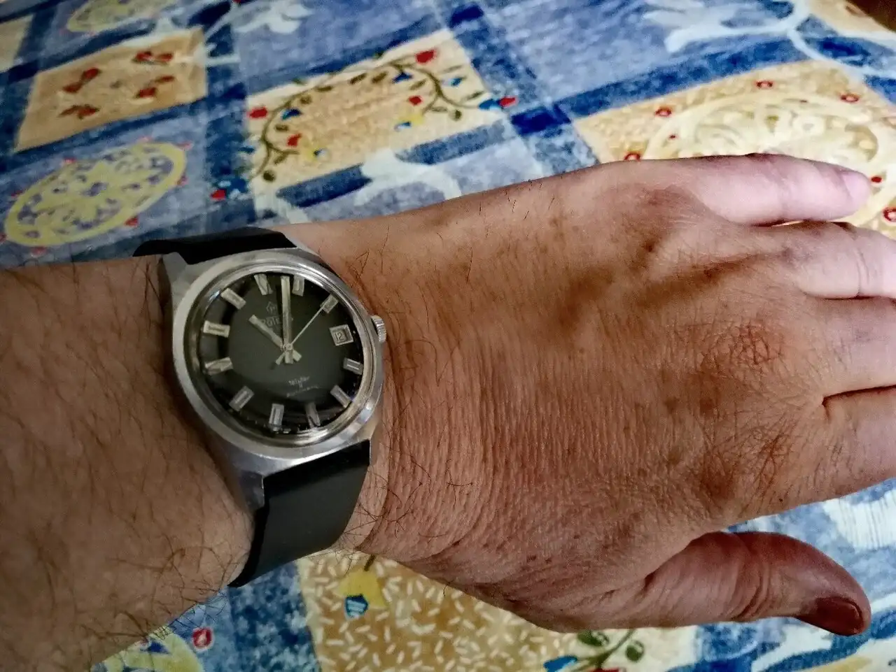 Me permito presentar este reloj, que me regaló uno de mis hermanos en 1970. Lo usé durante unos tres años, y desde entonces ha estado guardado. El cristal estaba muy rayado y el marco del calendario suelto, así que me lo han revisado y puesto una correa de caucho. Queda un poco pequeño en mi muñeca de 18,5 (mi señora dice que es un reloj de niño) pero lo voy a llevar una temporada a ver qué tal va.