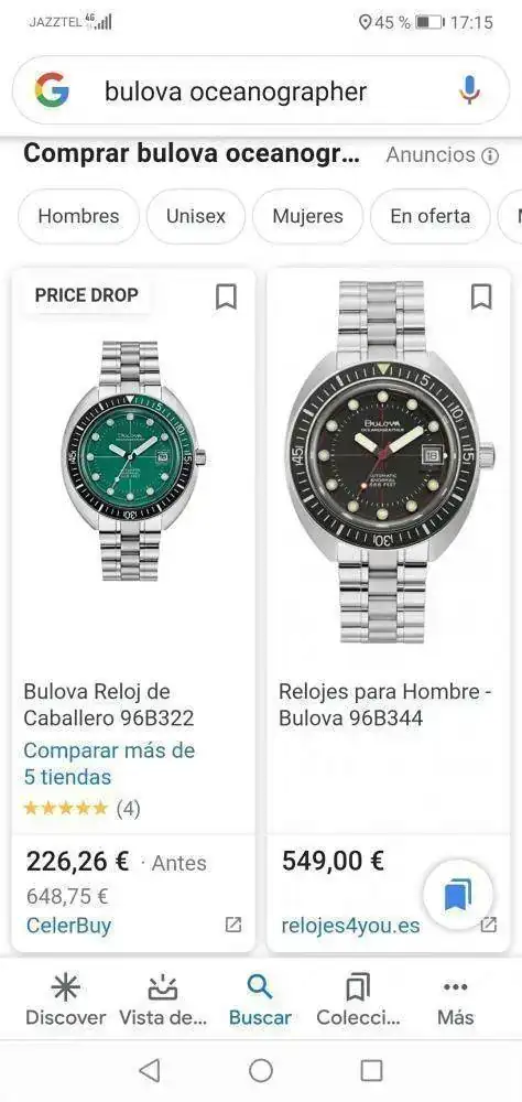 Trasteando por internet me he encontrado con el precio del Bulova Oceanographer que figura a la izquierda en la fotografía. Dado que parece sospechosamente bajo, os pregunto: ¿Alguno de vosotros ha hecho compras en esa tienda virtual? ¿En cualquier caso, no os parece también a vosotros un precio sospechosamente bajo?