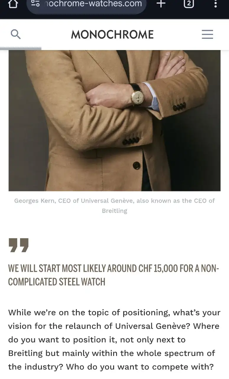 ¿Quiere eso decir que me parece bien que el precio de entrada de la nueva UG vaya a ser de 15.000 € para arriba? Ni de broma. Como se ha dicho ya en este mismo hilo, ni siquiera los consideraría por la mitad de ese precio. Pero eso no quita para que les augure un futuro prometedor... para ellos. Y no, no es un globo sonda: UG va a posicionarse por encima de Breitling. Kern ha dicho en la entrevista que ya tienen configurado el libro de ruta para los próximos diez años, y uno no tiene eso listo si duda del posicionamiento.