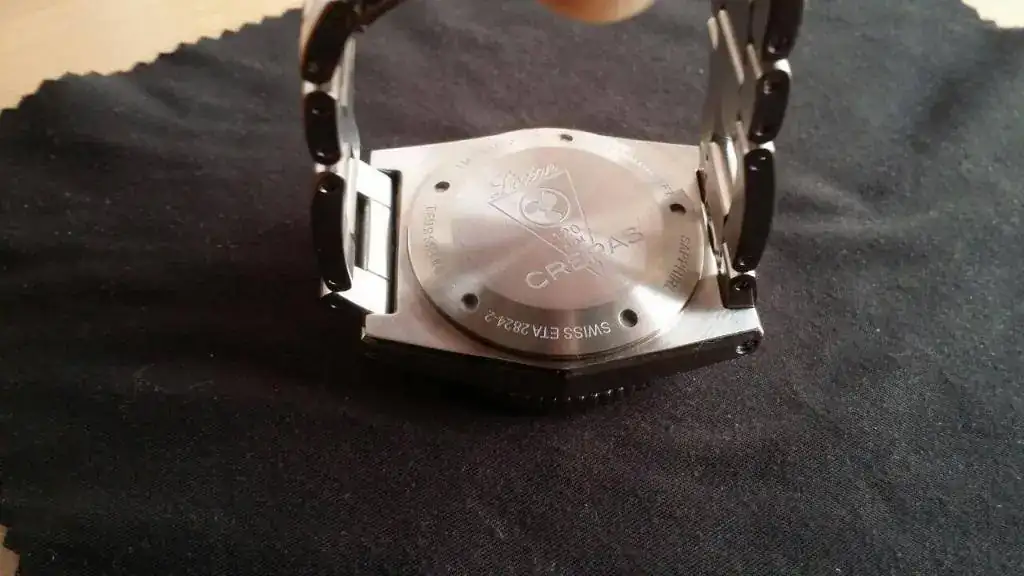 -Hermético hasta 120 atmósferas de presión bajo el agua/1.200 metros. Tapadera trasera y corona cerrada a rosca.