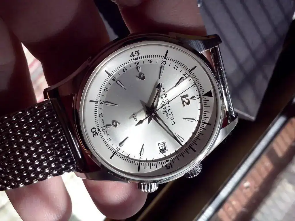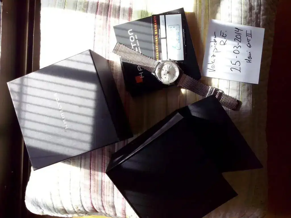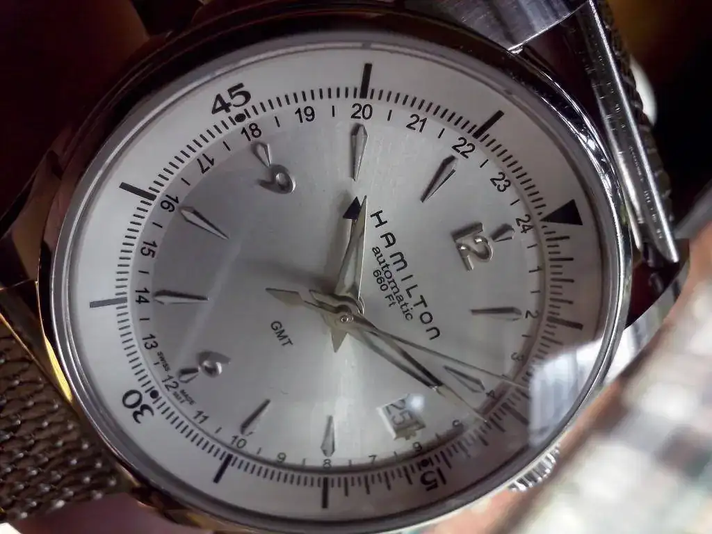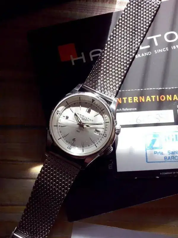 Pues dada las últimas incorporaciones, le estoy pegando una subida importante a mi colección. Así que saco este precioso Hami, el traveller GMT II, muy raro y desde luego bonito. Lo compre en su día persiguiendo la estética del Legend diver, pero buscando un toque de originalidad. El dial es una precisosidad, de color plata, índices y números aplicados con lumínica en índices. Aguja GMT 24 h. Con punta flecha de color azul