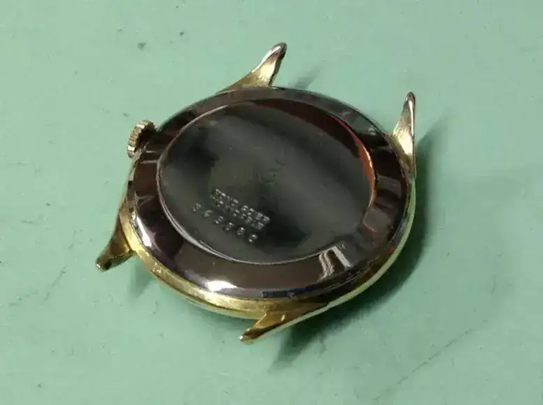 La caja lleva un baño de oro. Está en un estado bastante bueno. La tapa trasera es de acero inoxidable.