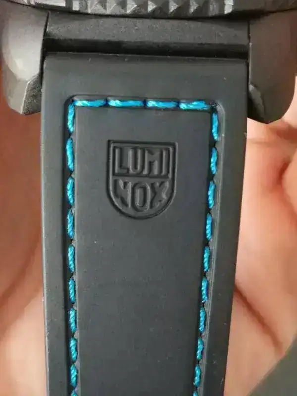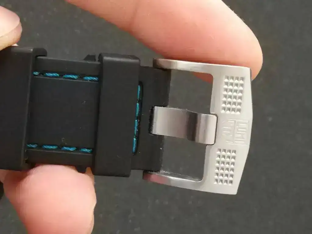 Tiene una correa de caucho con pespunte azul. Un toque muy fresco. La hebilla de acero con el logo de la marca.