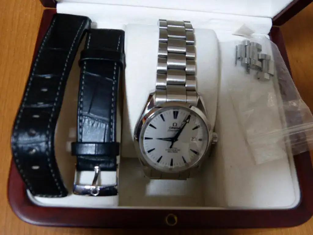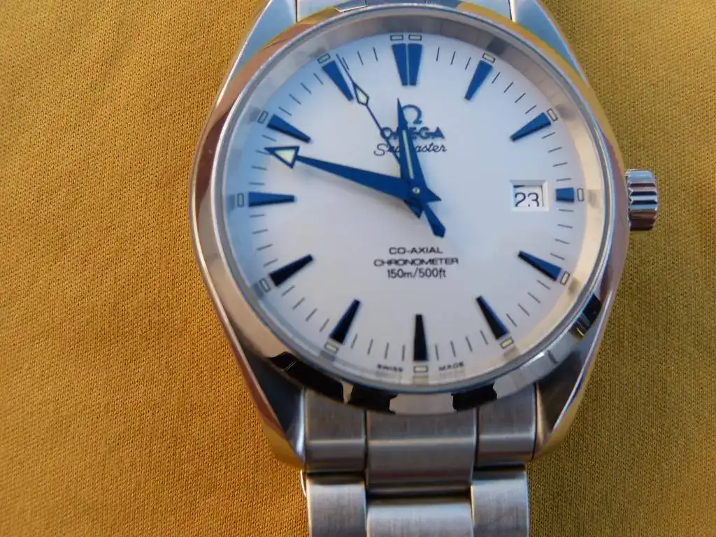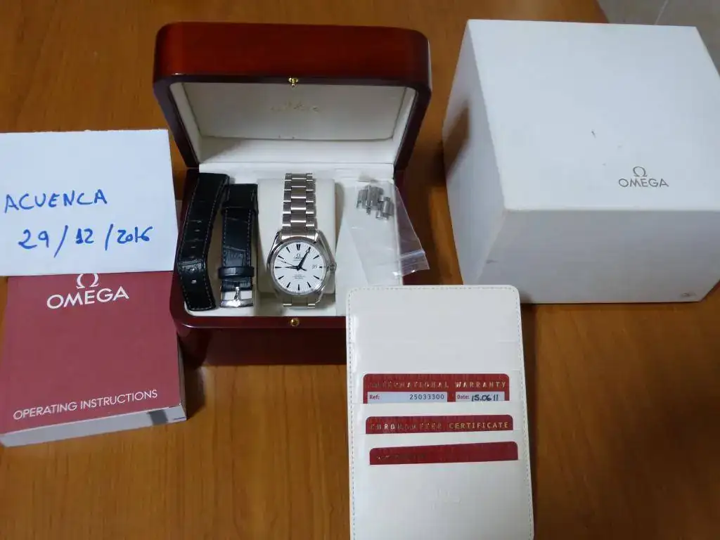 Tras mucha reflexión y haber recibido otro regalíto, pongo a la venta mi precioso omega aquaterra , con calibre CO AXIAL 2500, es el modelo 25033300 (agujas e indices azules Turquesa), el más buscado de Omega AquaTerra. esta en muy buen estado yo diria de 9 de 10,por los típicos pelillos porque no es a estrenar, ya que ha sido puesto en muy pocas ocasiones solo algún que otro evento.Lo entrego con tarjetas, tarjetero, caja de madera ya que queda más elegante, caja exterior cartón blanco, y libro omega. Fue comprado por mi en CO nacional , osea único propietario y muy bien cuidado.