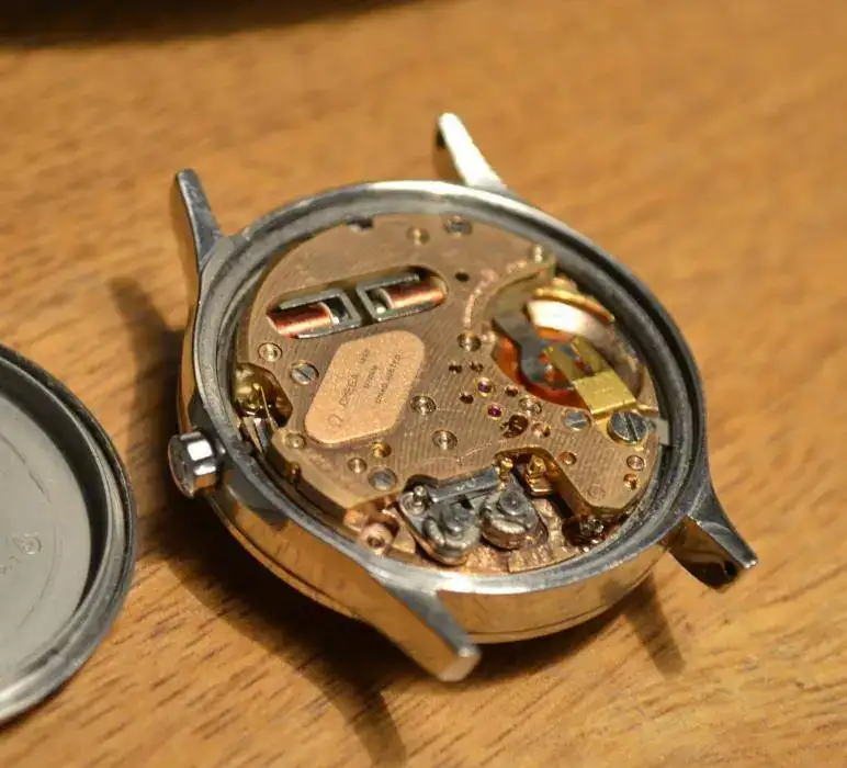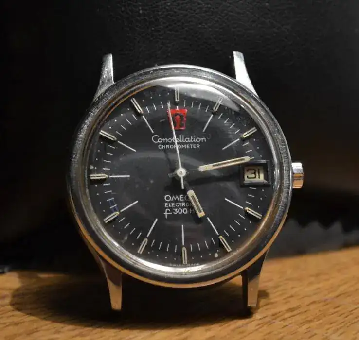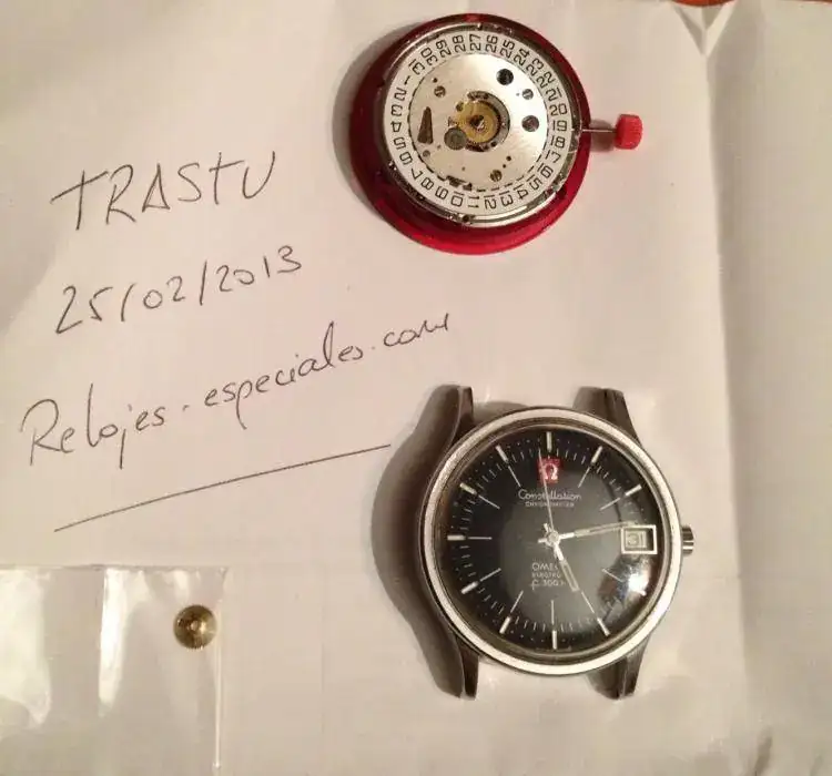 Se trata de un Omega Constellation f300 que está sin funcionar, pero que acompaño con un calibre ESA9162 NOS nunca utilizado funcionando a la perfección, así que hará falta o substituir el calibre Omega o utilizar las piezas del otro para que funcione el calibre firmado Omega. El calibre ESA9162 lo acabo de comprar en un forniturista de París que tiene muchas piezas de viejo Stock y algún calibre suelto. Hace tiempo me dijo que me conseguiría éste y me lo consiguió, el problema es que para cuando me lo ha conseguido yo ya he encontrado otro f300 completo.